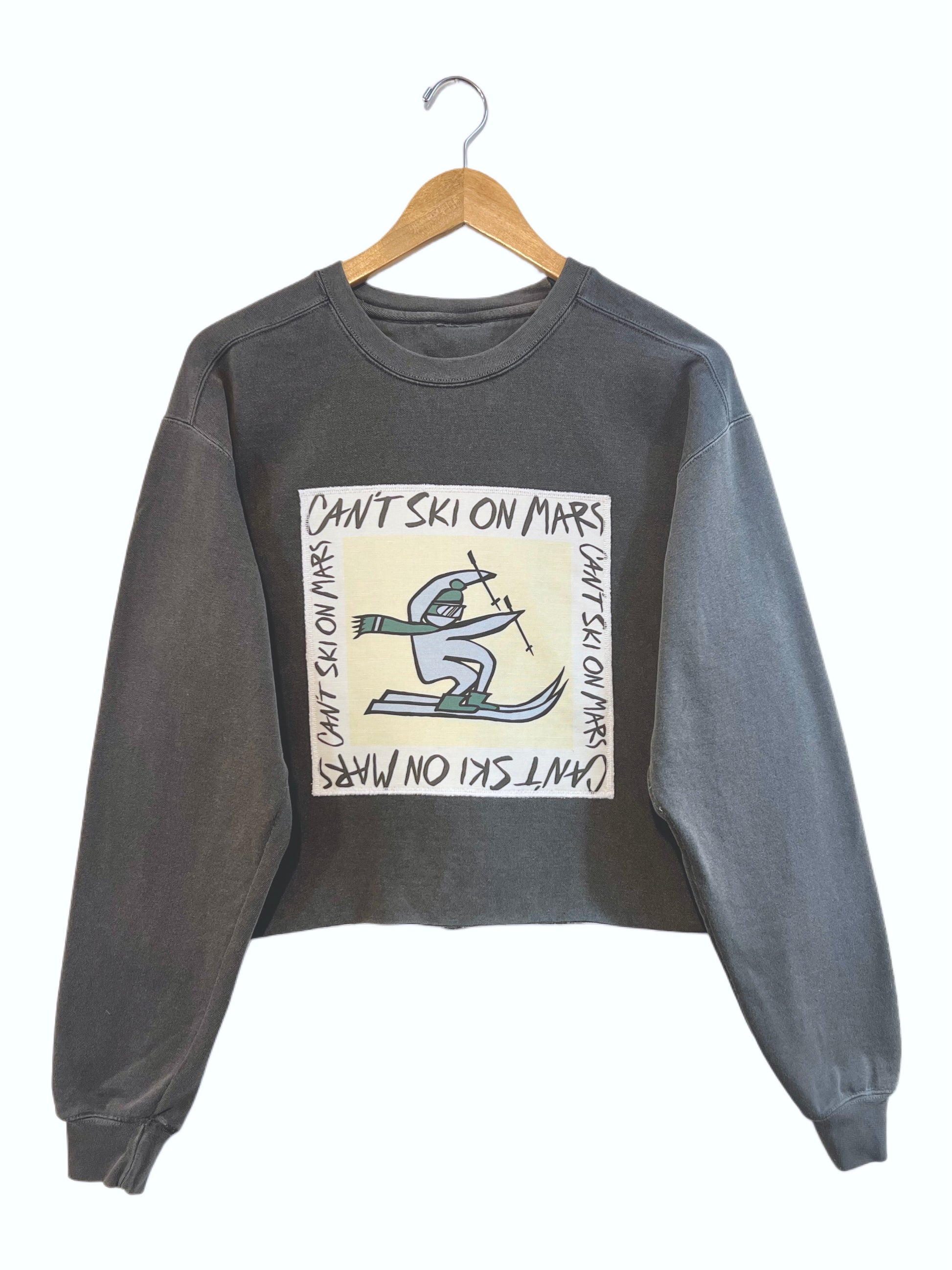 A classic crewneck in Vintage Black. Enhanced with our customer favorite Can't Ski On Mars patch sewn on front & center.