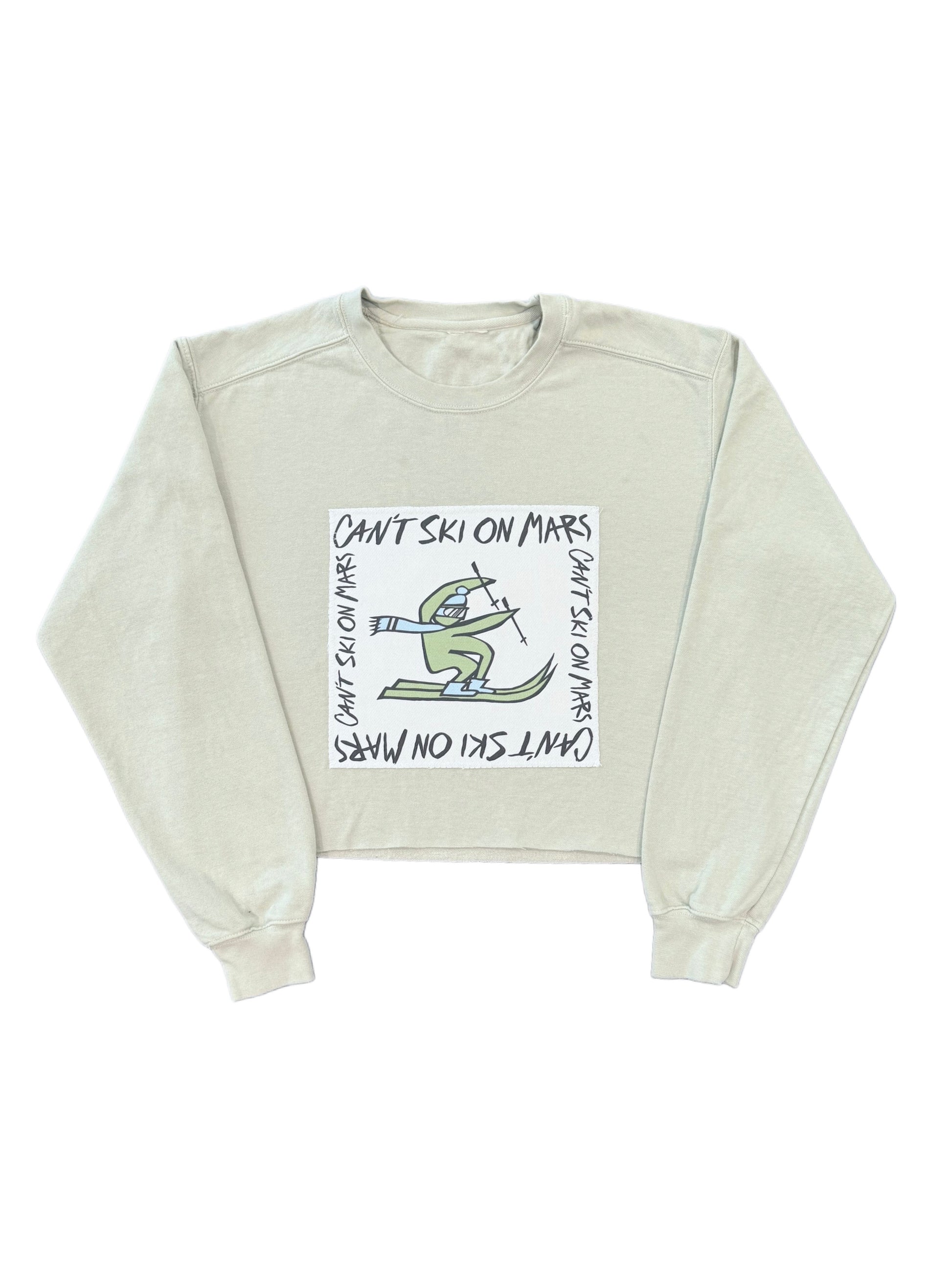 A classic crewneck in our latest color way, Oyster - a unique light sandy green. Enhanced with our customer favorite Can't Ski On Mars patch sewn on front & center.