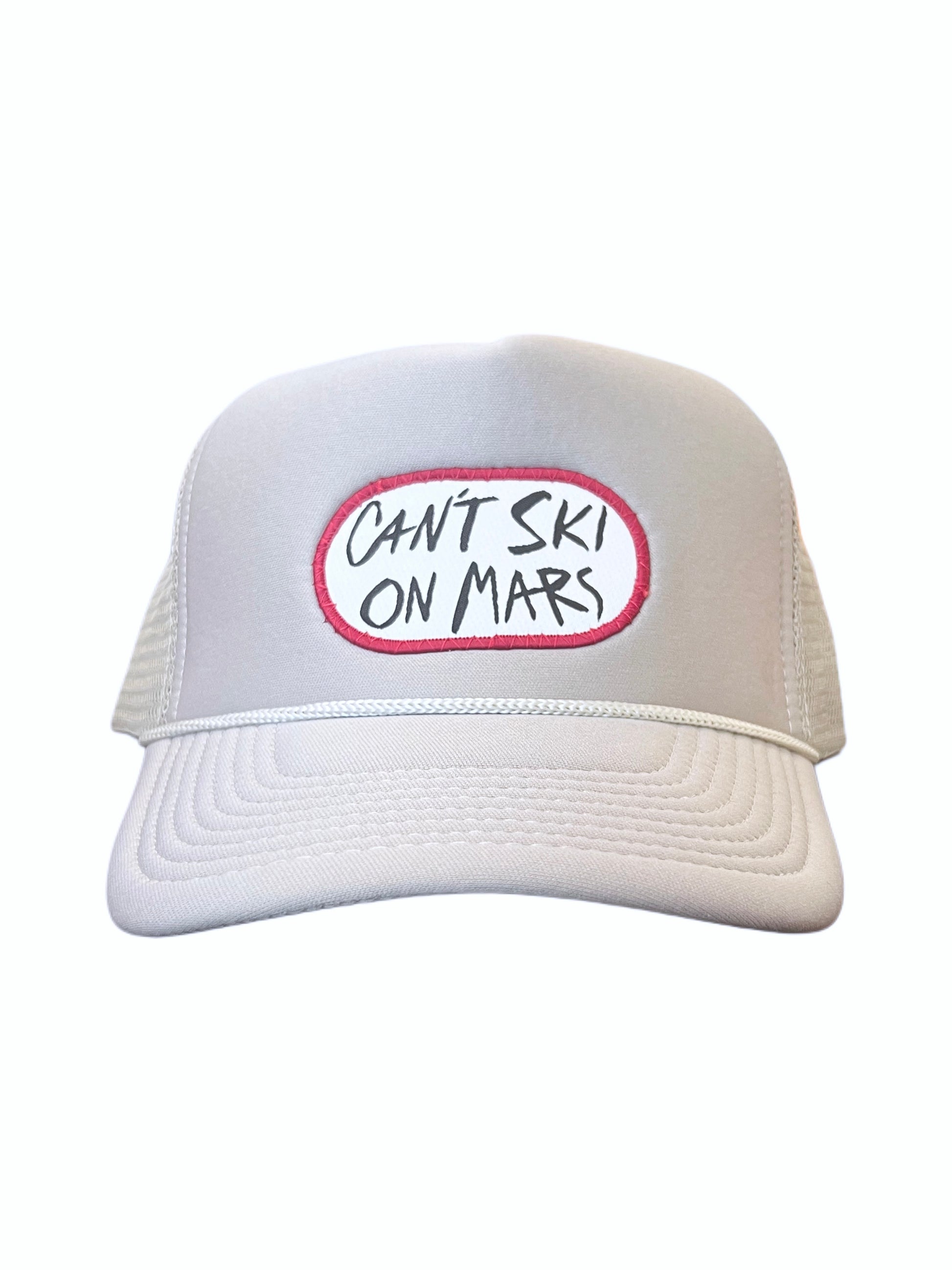 A retro inspired, trucker hat in monochromatic khaki. Enhanced with our Can't Ski On Mars patchwork on the front.