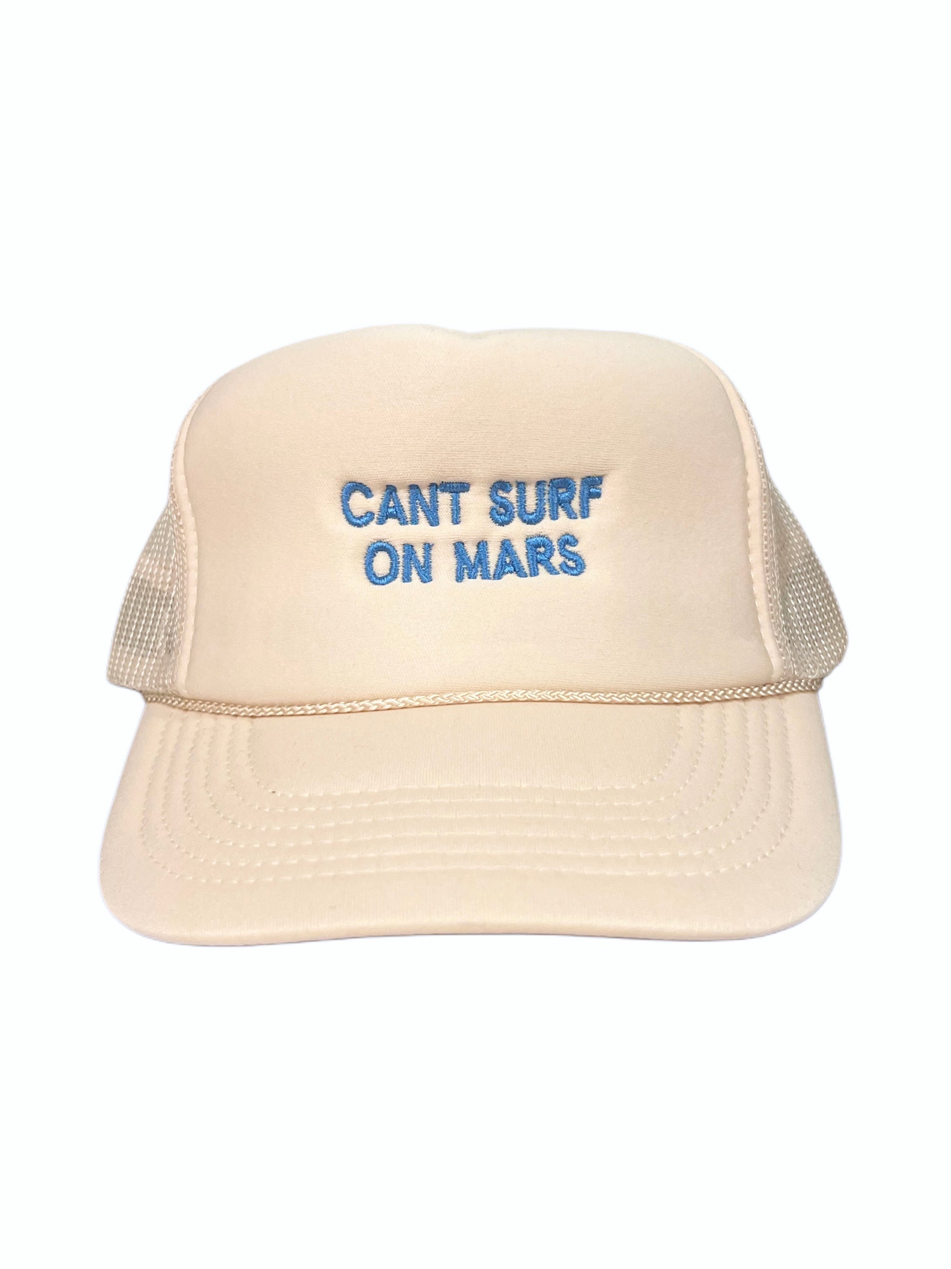 A retro inspired, trucker hat in monochromatic ivory. Enhanced with "NO SURF ON MARS" embroidered on the front in blue.