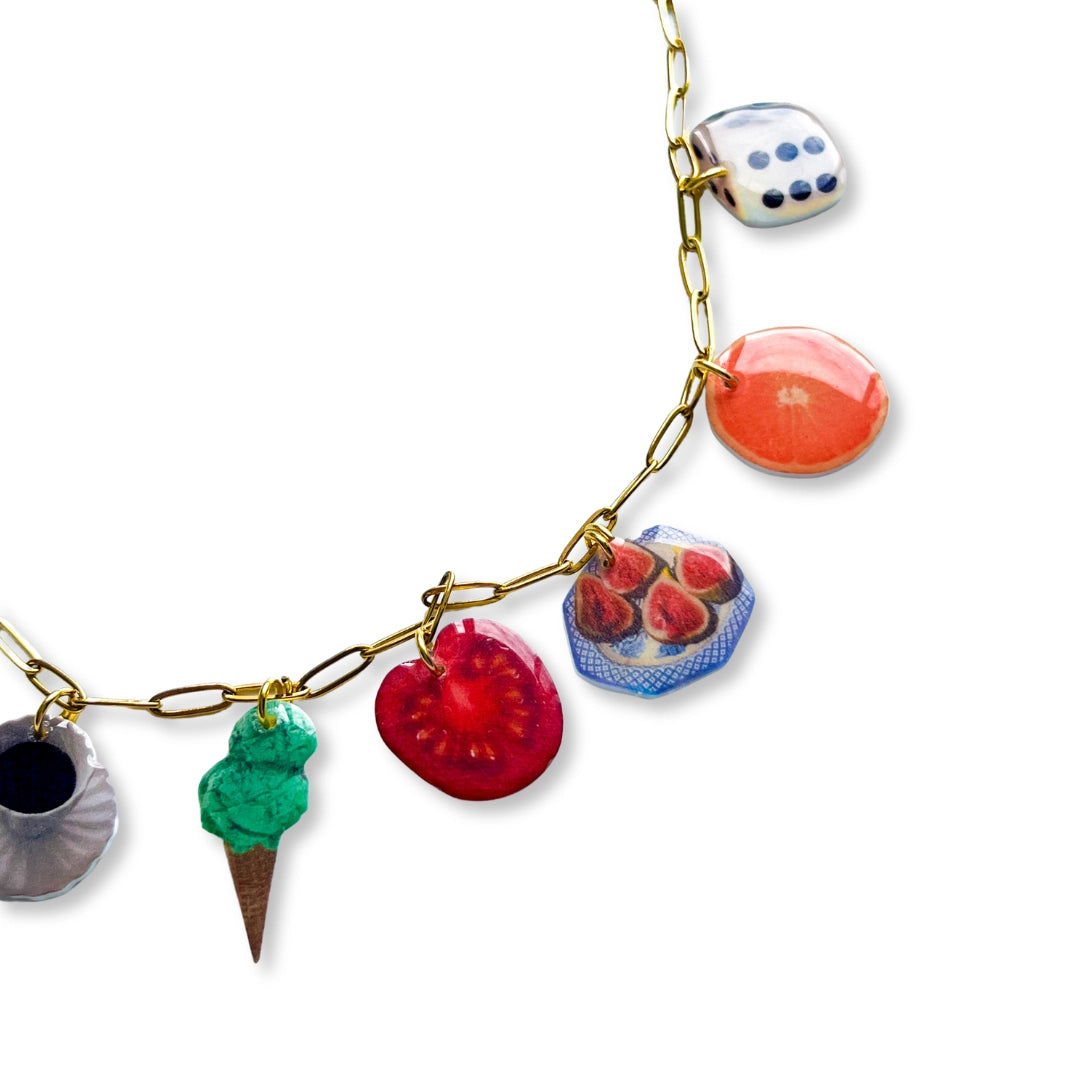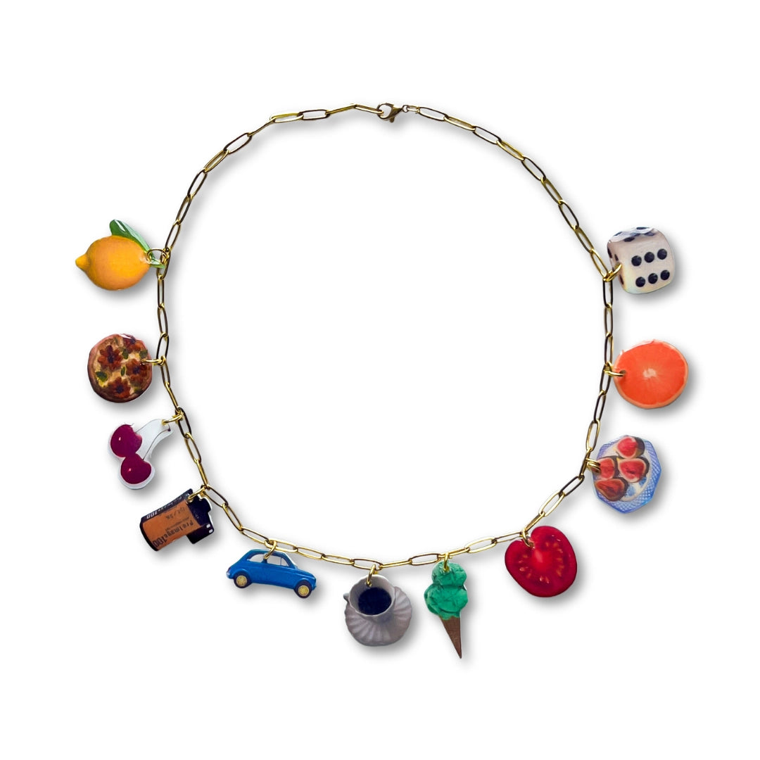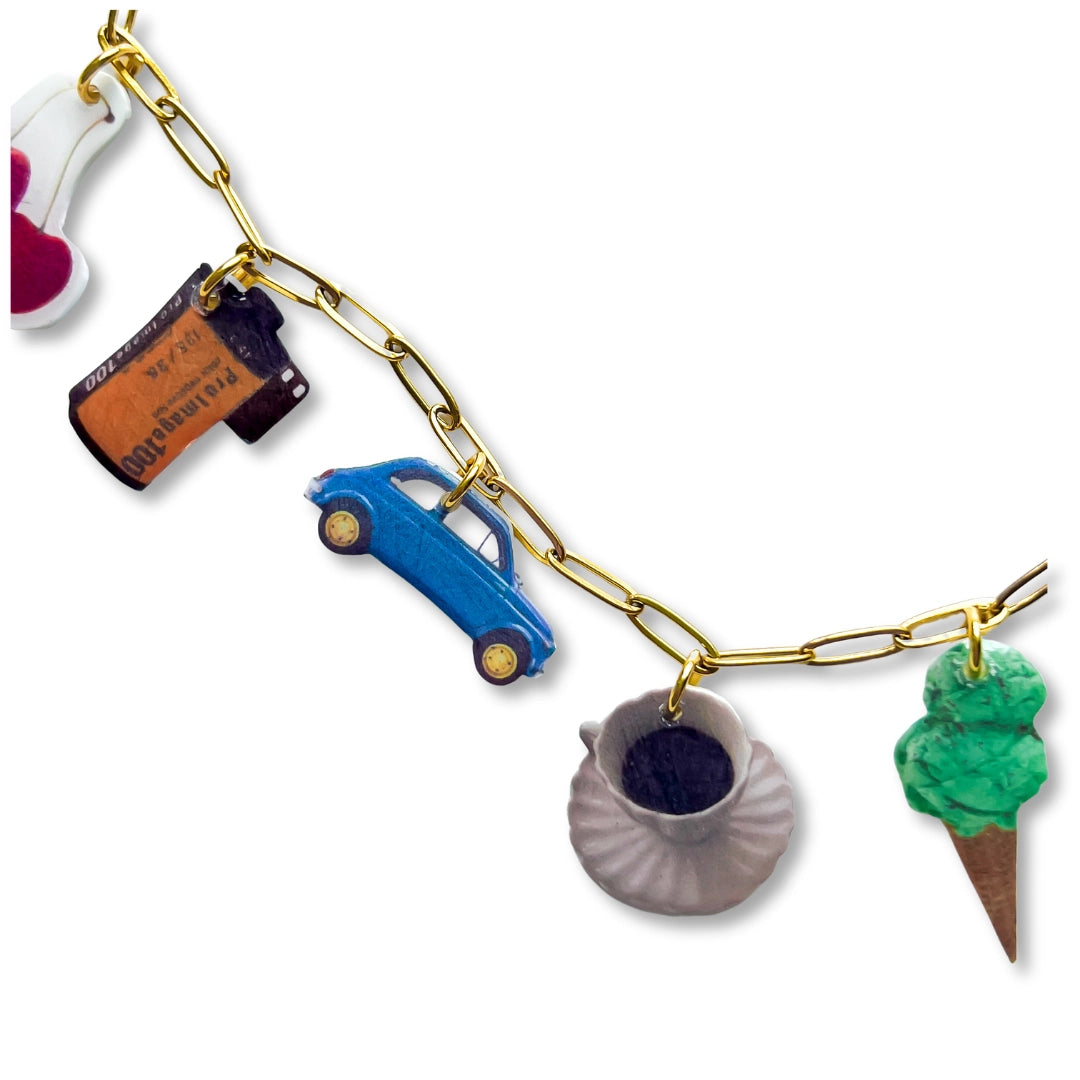 A totally unique charm necklace. Gold plated stainless steel hand made with lightweight photo - realistic charms.