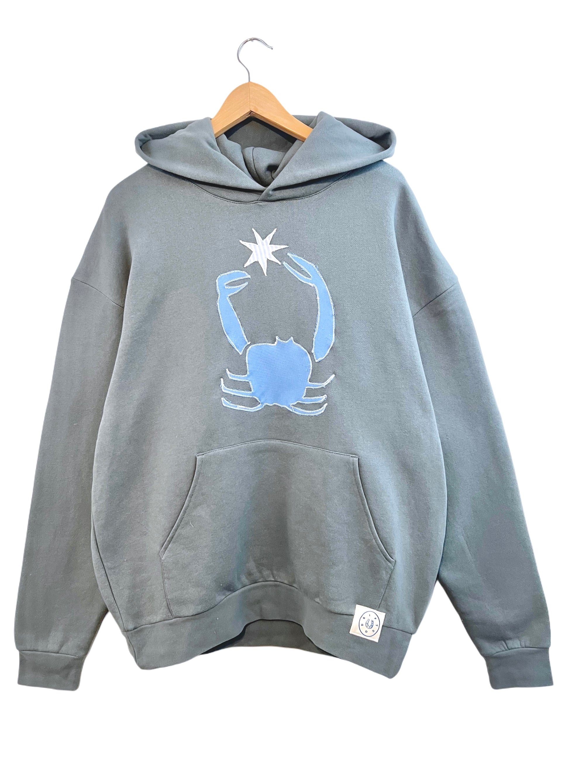 Our latest project. Contrasting crab and star cut from reclaimed fabric scraps. Combined to create a one of a kind patch, upcycled patch. Sewn onto a high quality pigment dyed hoodie.