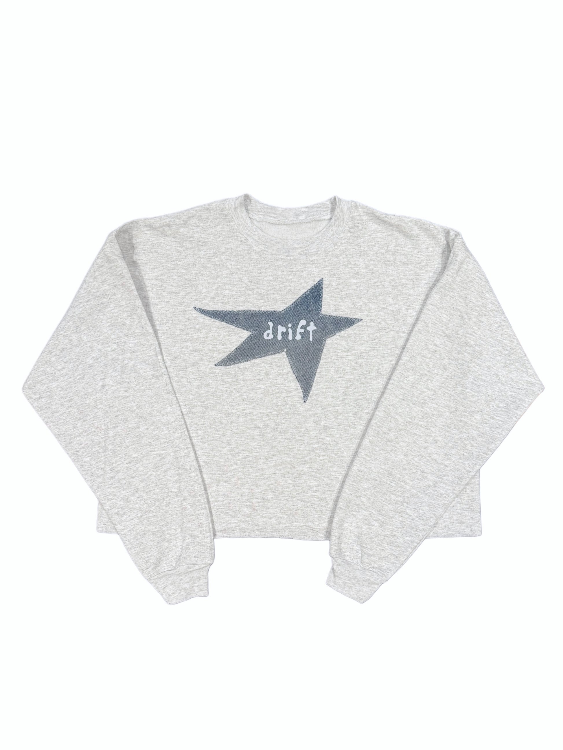 A retro inspired crew in Ash with a 1 of a kind asymmetric denim star.