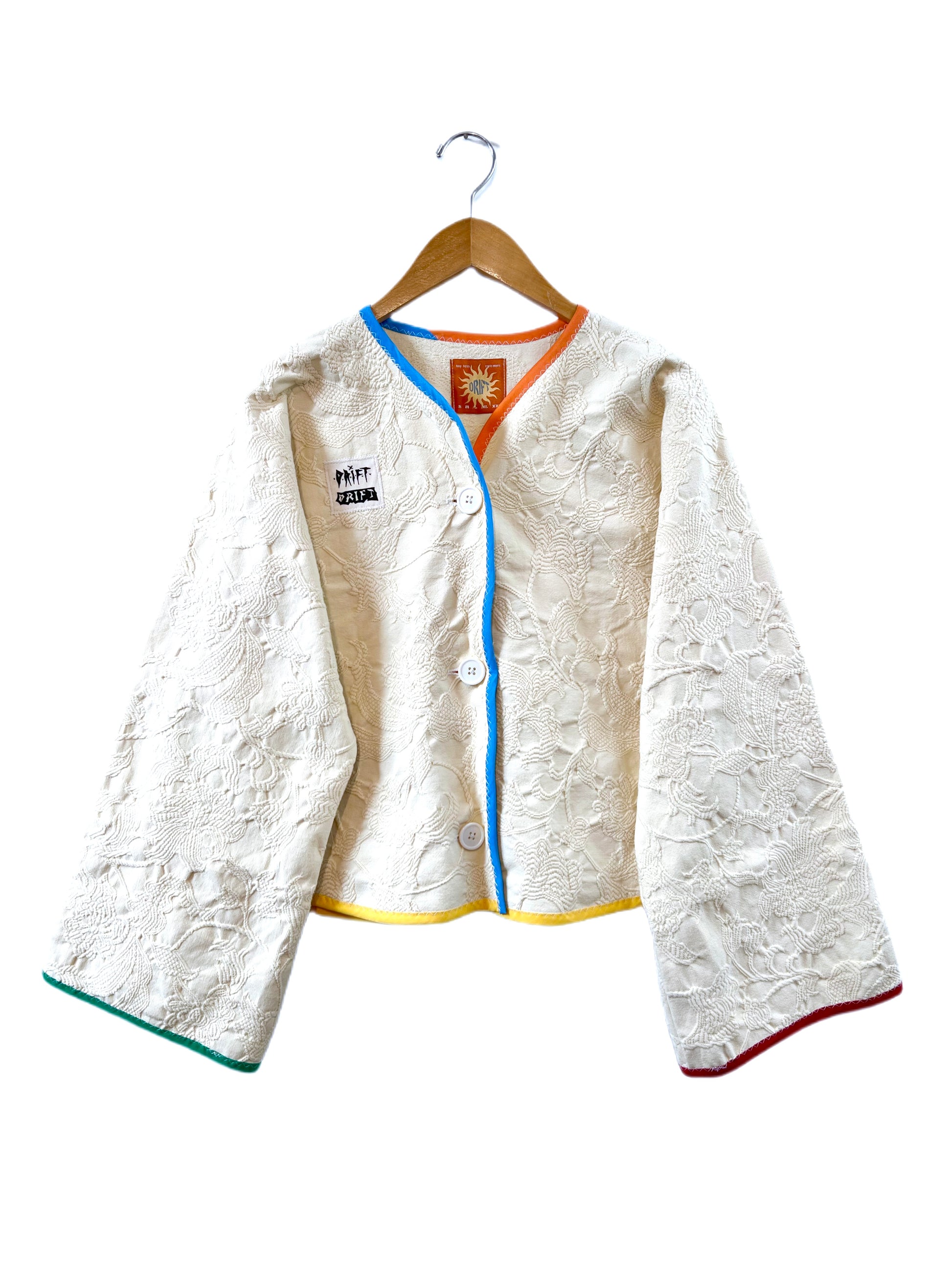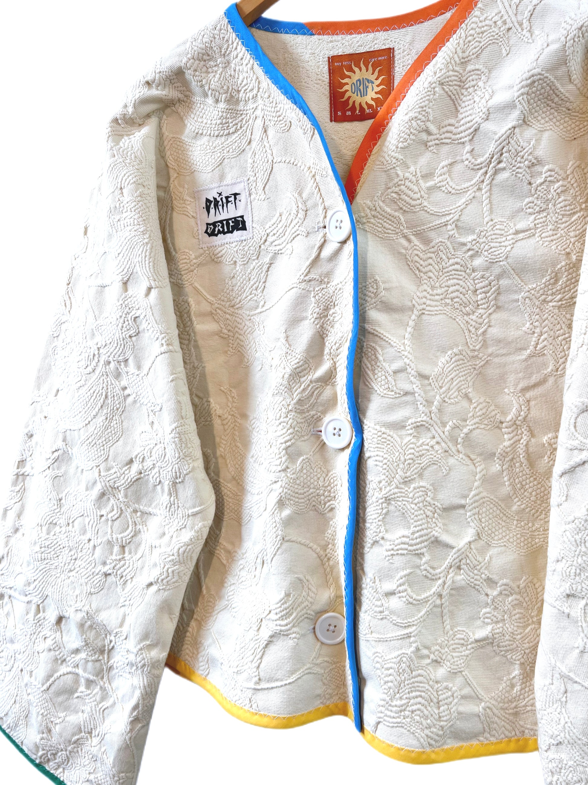 A truly one of a kind cardigan/jacket created entirely from locally sourced, upcycled materials. Individually designed and sewn in-house at Drift.