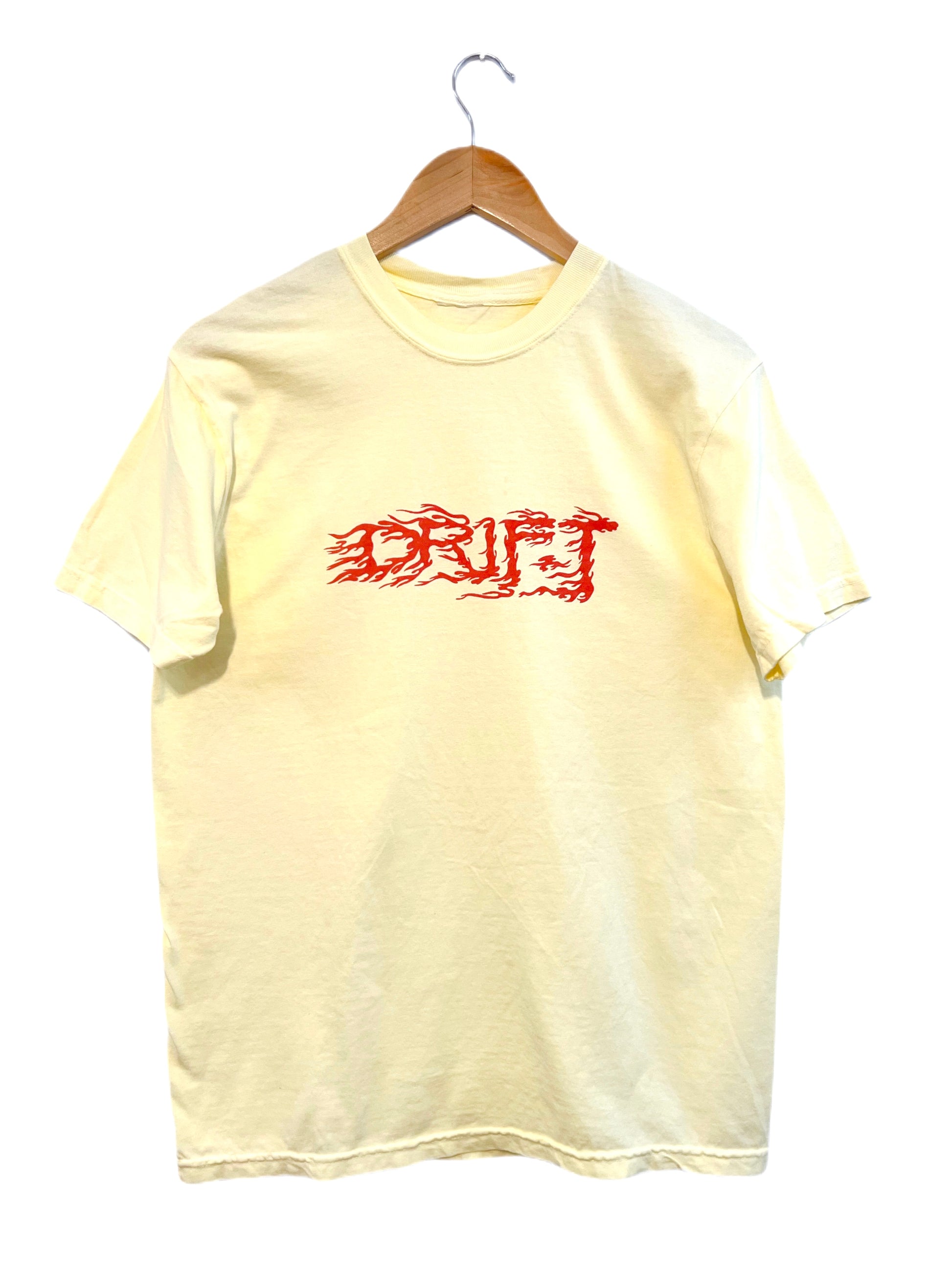 Classic tee in yellow, hand-printed with our Drift Smoke graphic in orange.