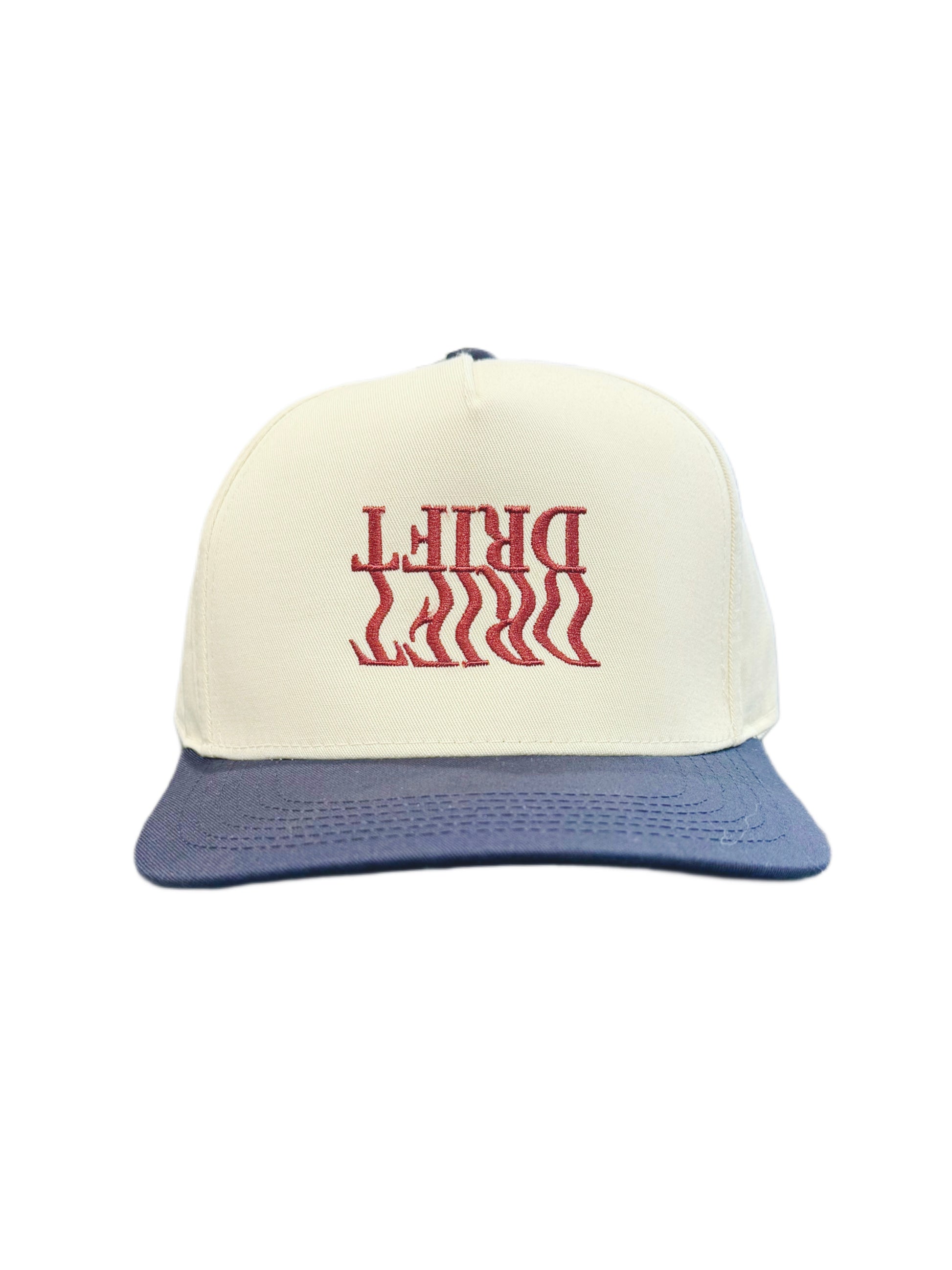 A retro inspired snapback in cream with contrasting navy details. Enhanced with our Echoes embroidery on the front in maroon.