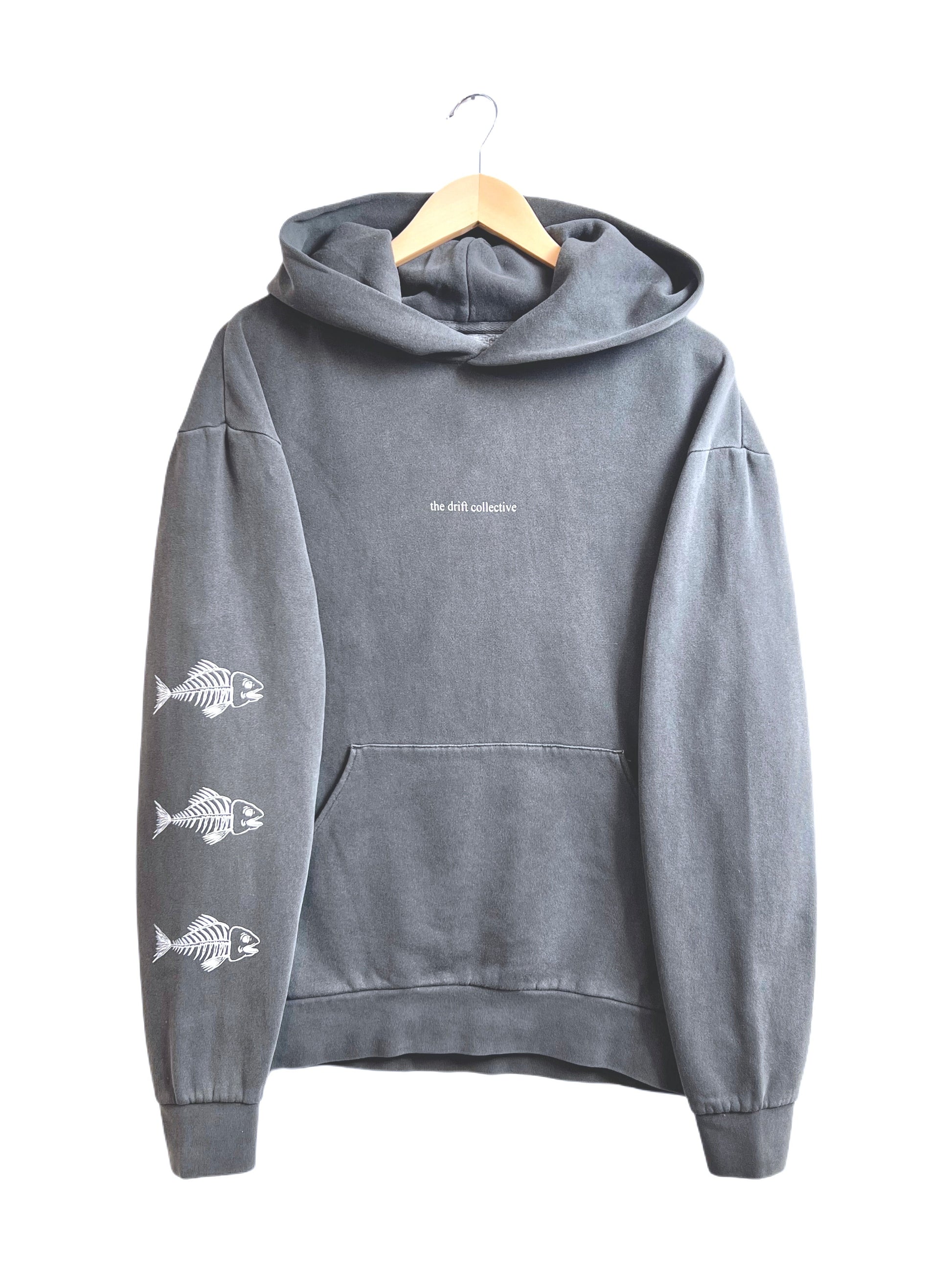 A classic hoodie in a retro inspired Vintage Black. Screen printed in white with "The Drift Collective" on the front and our long time favorite Fish Bonez graphic on the sleeve. Printed by hand at our shop using eco-friendly, water based ink.