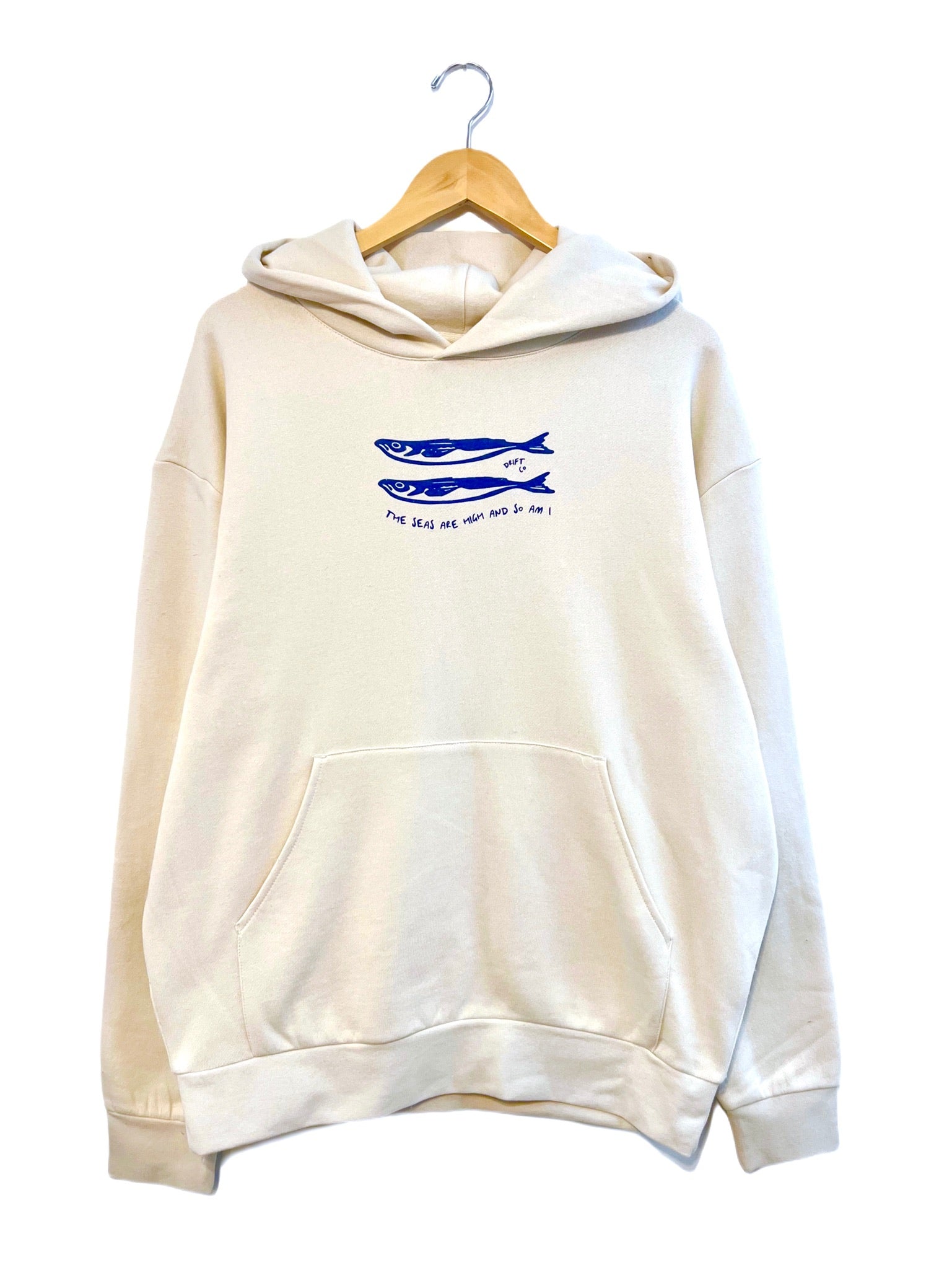 A classic hoodie in light sand. Screen printed by hand using water based, eco-friendly ink at our shop in Portsmouth, NH. Featuring our new High Seas graphic on the front in slate blue.