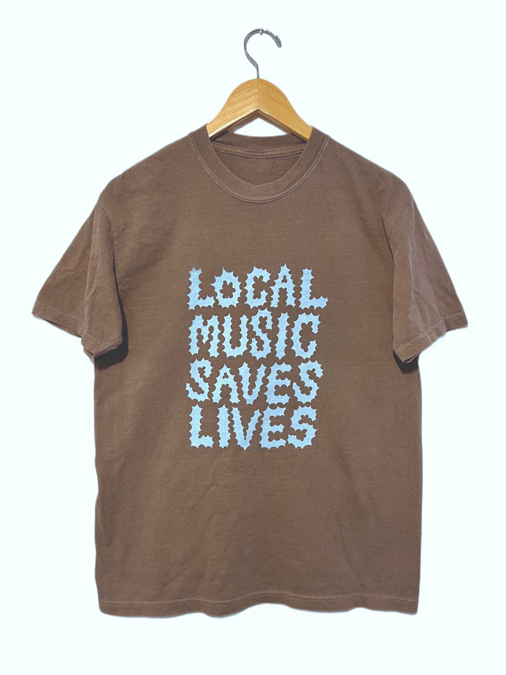 A cocoa tee enhanced with our Local Music Saves Lives graphic on the front in baby blue.