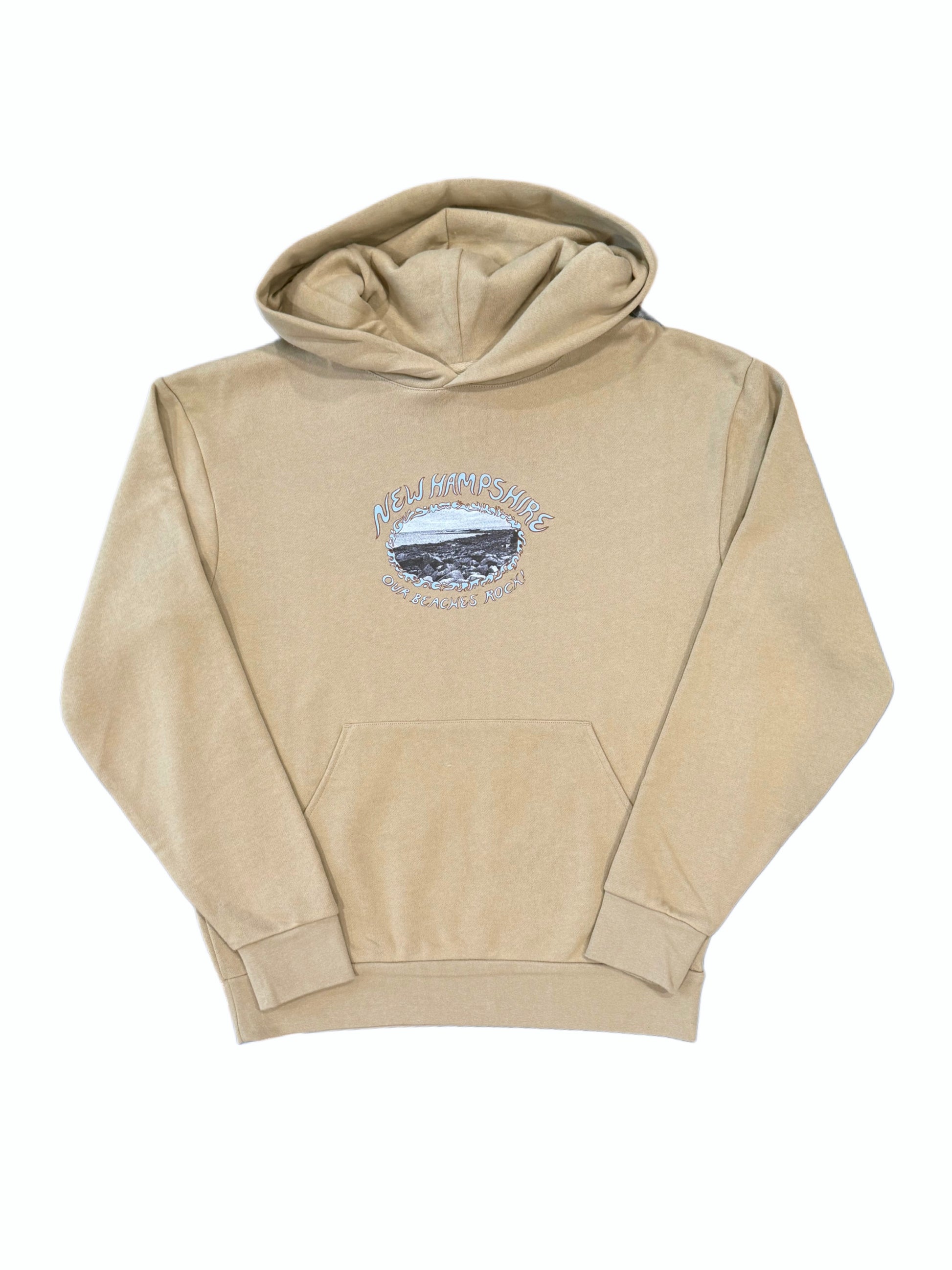 A retro inspired, classic hoodie in Sand. Featuring our Maine Beaches Rock graphic.