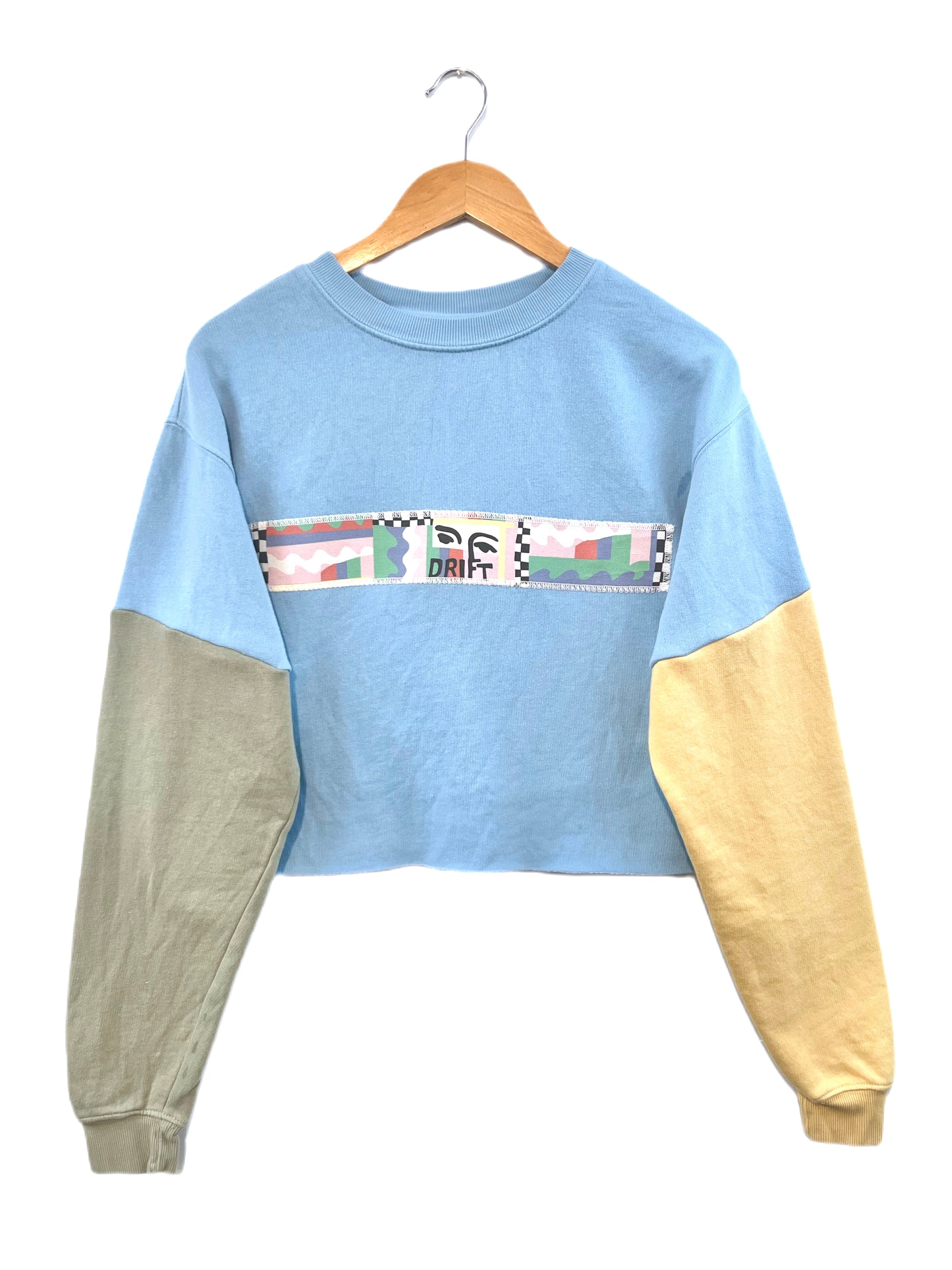 From our collection of colorblocked crews locally dyed, in vintage inspired shades. Sky Blue base recreated with sleeves in Mustard & Army. Enhanced with our Mindlessness patchwork on the front.