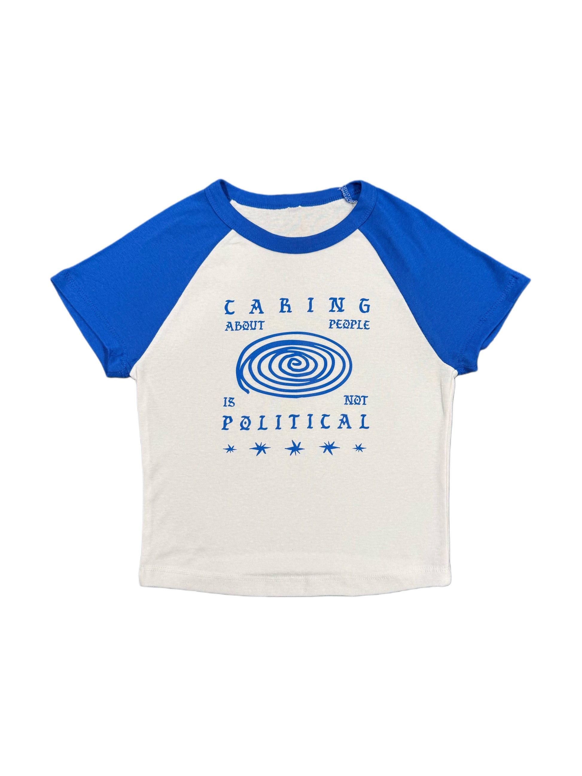 An insanely soft, baby tee in white with royal blue contrast sleeves. A fitted style in a cropped length. Featuring our “Caring about people is not political” graphic printed on the front.