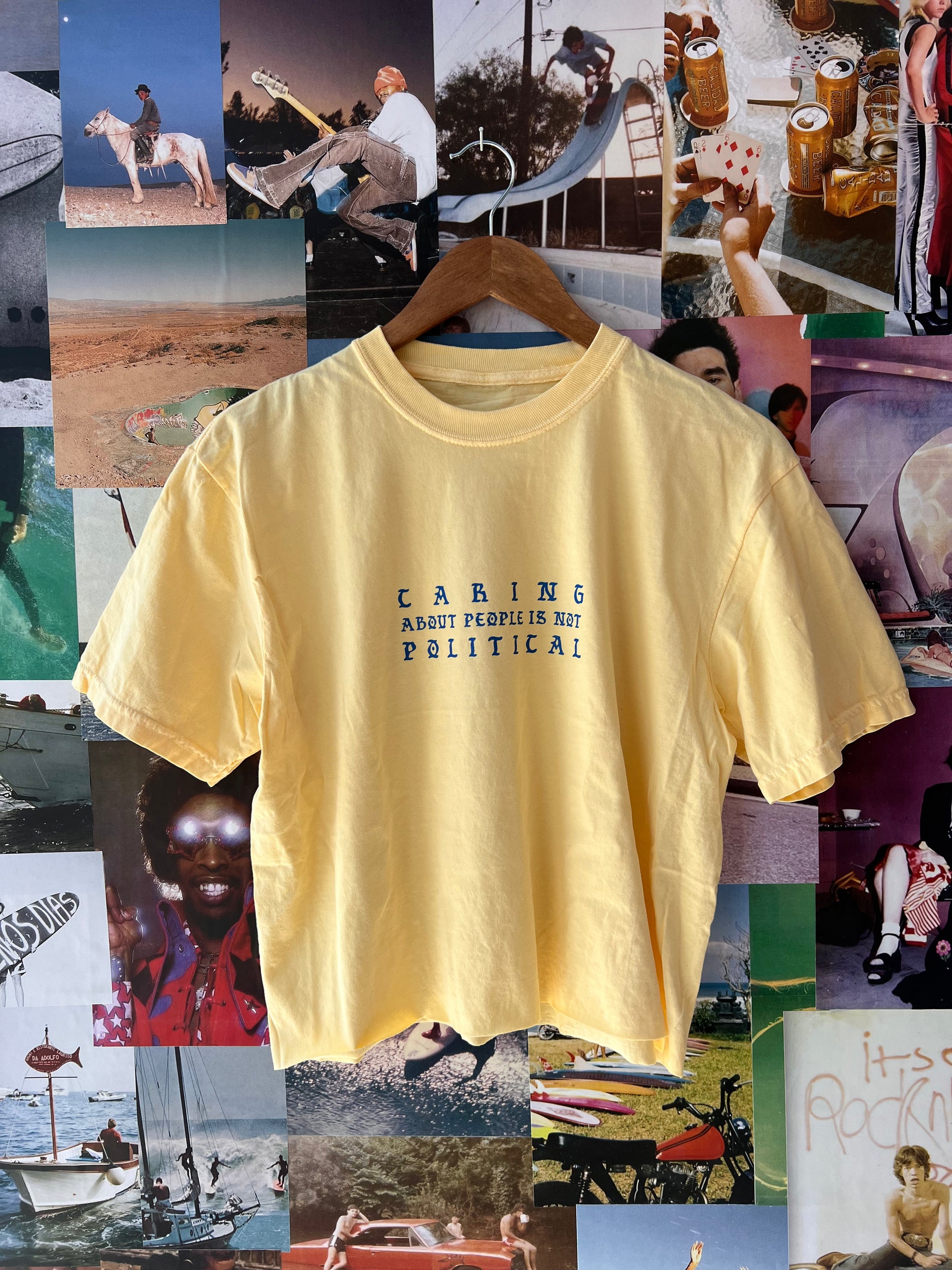 A retro inspired, cropped tee in Faded Yellow. Featuring our Caring About People is not Political graphic, printed in-house at Drift.