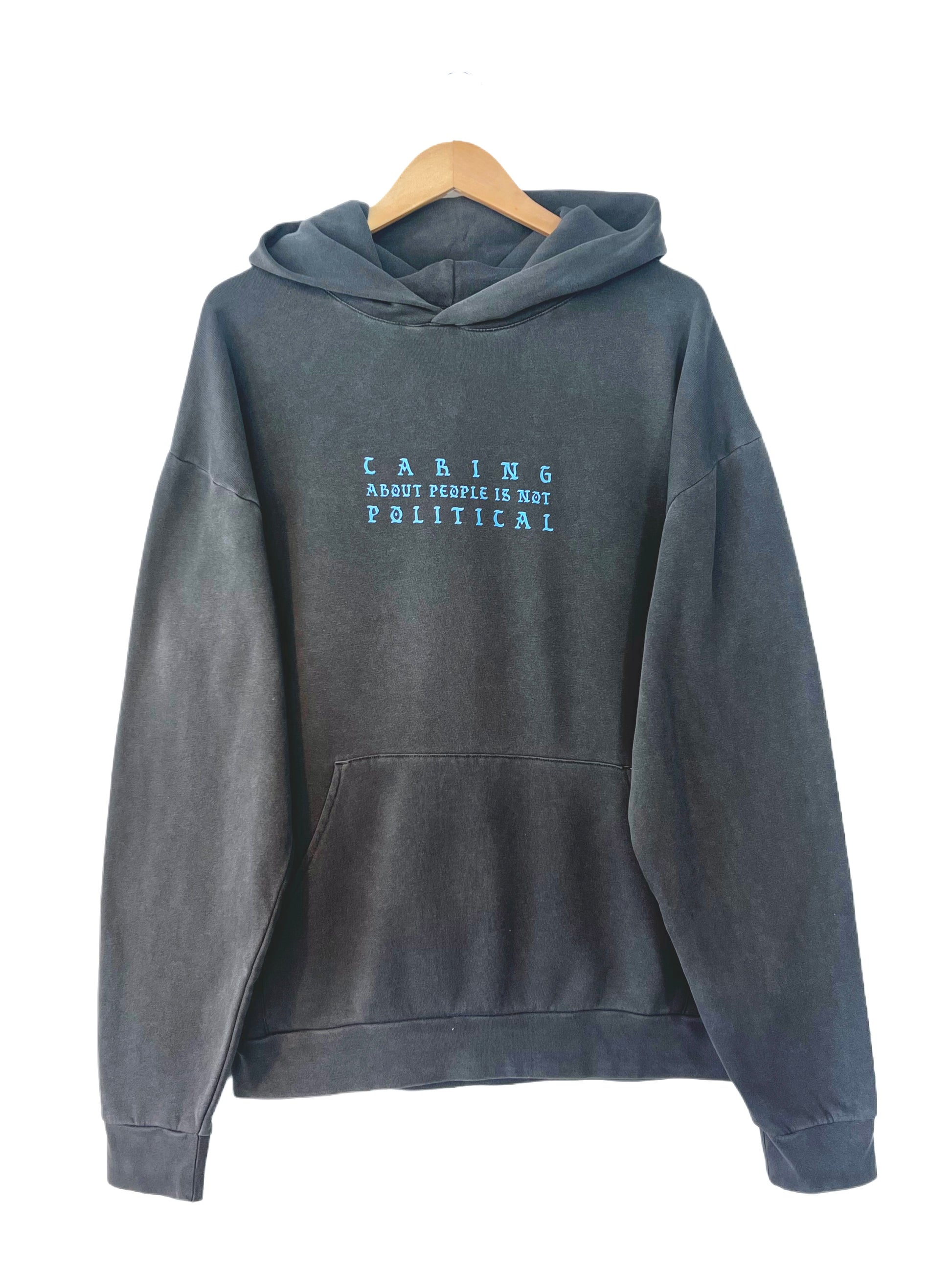 A retro inspired, classic hoodie in Vintage Black. Featuring our Caring About People is not Political graphic, printed in-house at Drift.