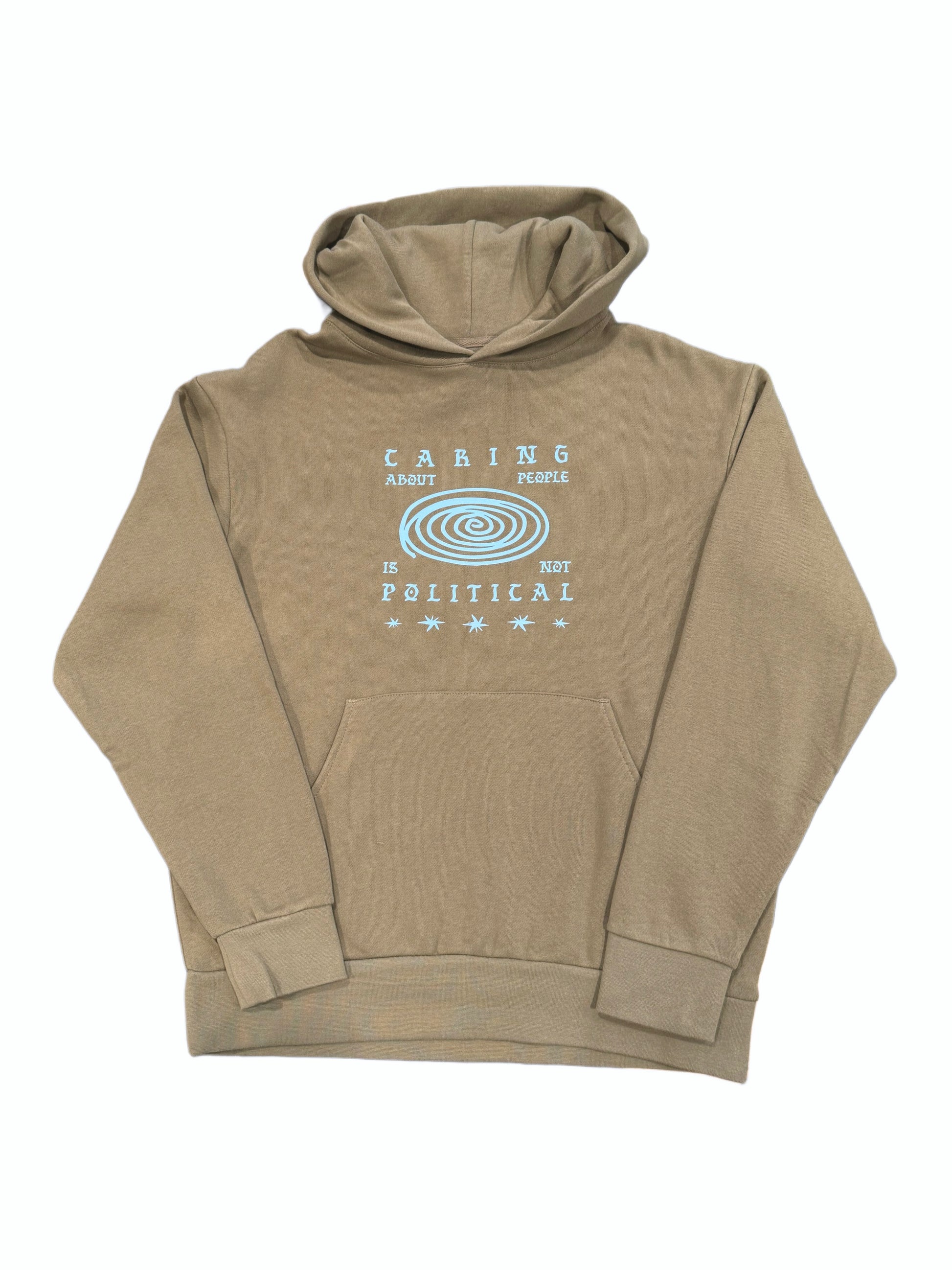 An insanely soft, premium hoodie in Army Green. Featuring our "Caring about people is not political" graphic printed on the front in blue.