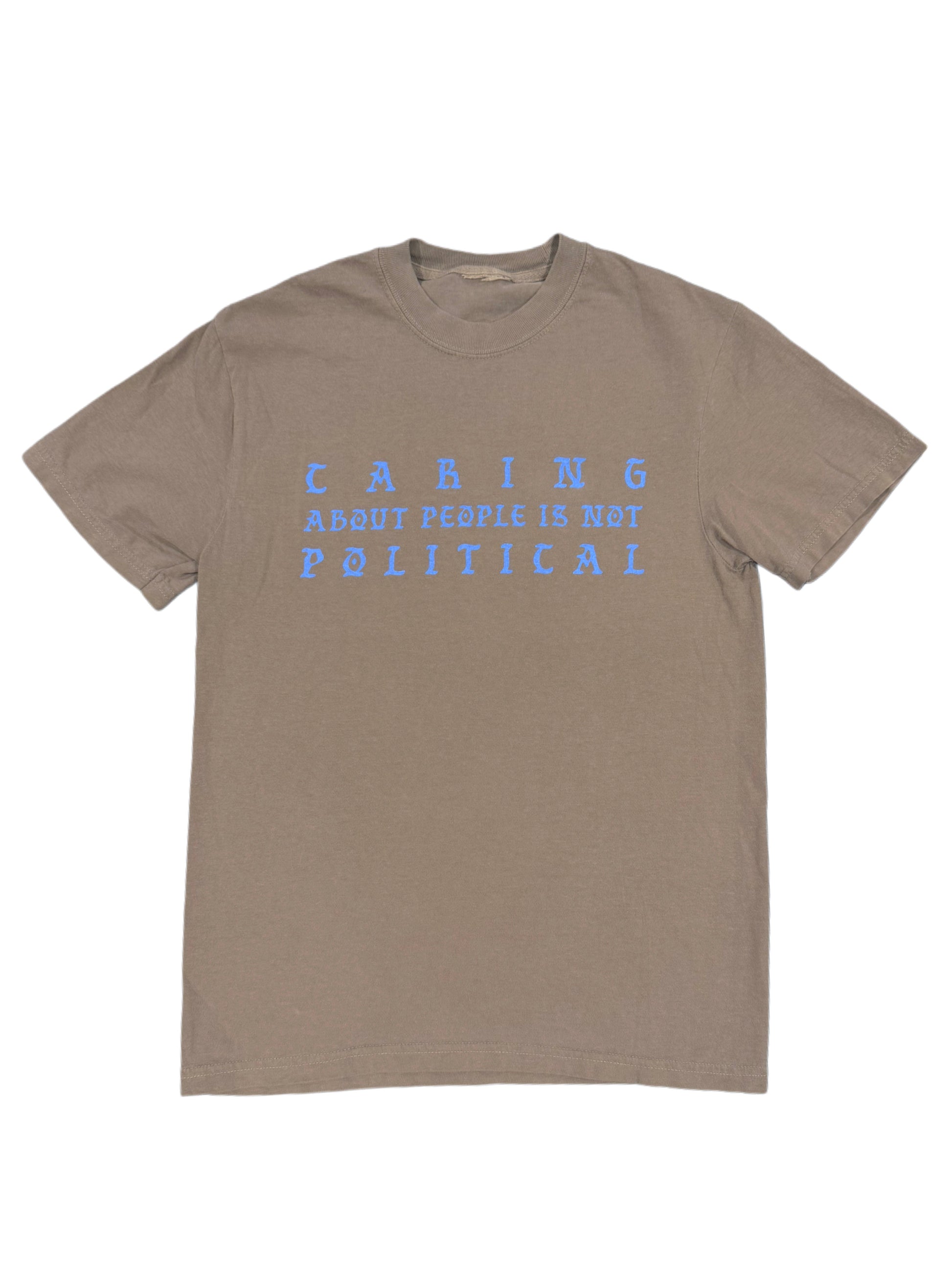 A retro inspired, classic tee in Espresso. Featuring our Caring About People is not Political graphic screen printed on the front using eco-friendly, water based ink.