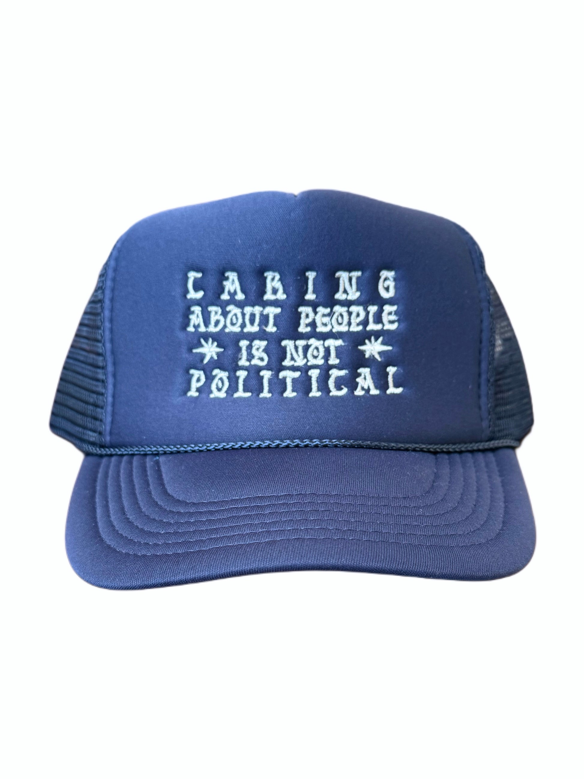 A retro inspired, trucker hat in monochromatic navy blue. Enhanced with "Caring about people is not political" embroidered on the front in white.
