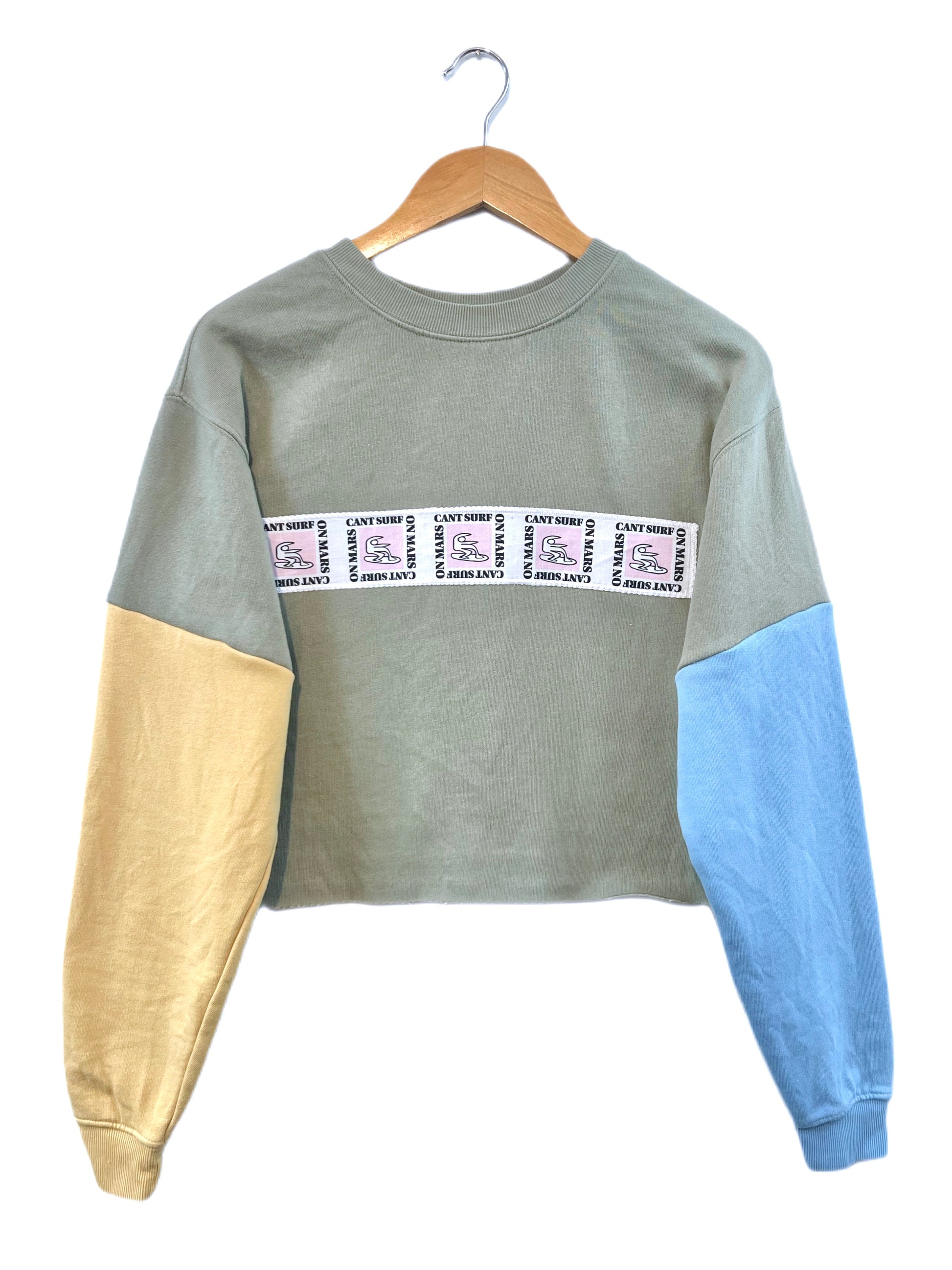 From our collection of colorblocked crews locally dyed, in vintage inspired shades. Army base recreated with sleeves in Mustard & Sky Blue. Enhanced with our Planet B patchwork on the front.
