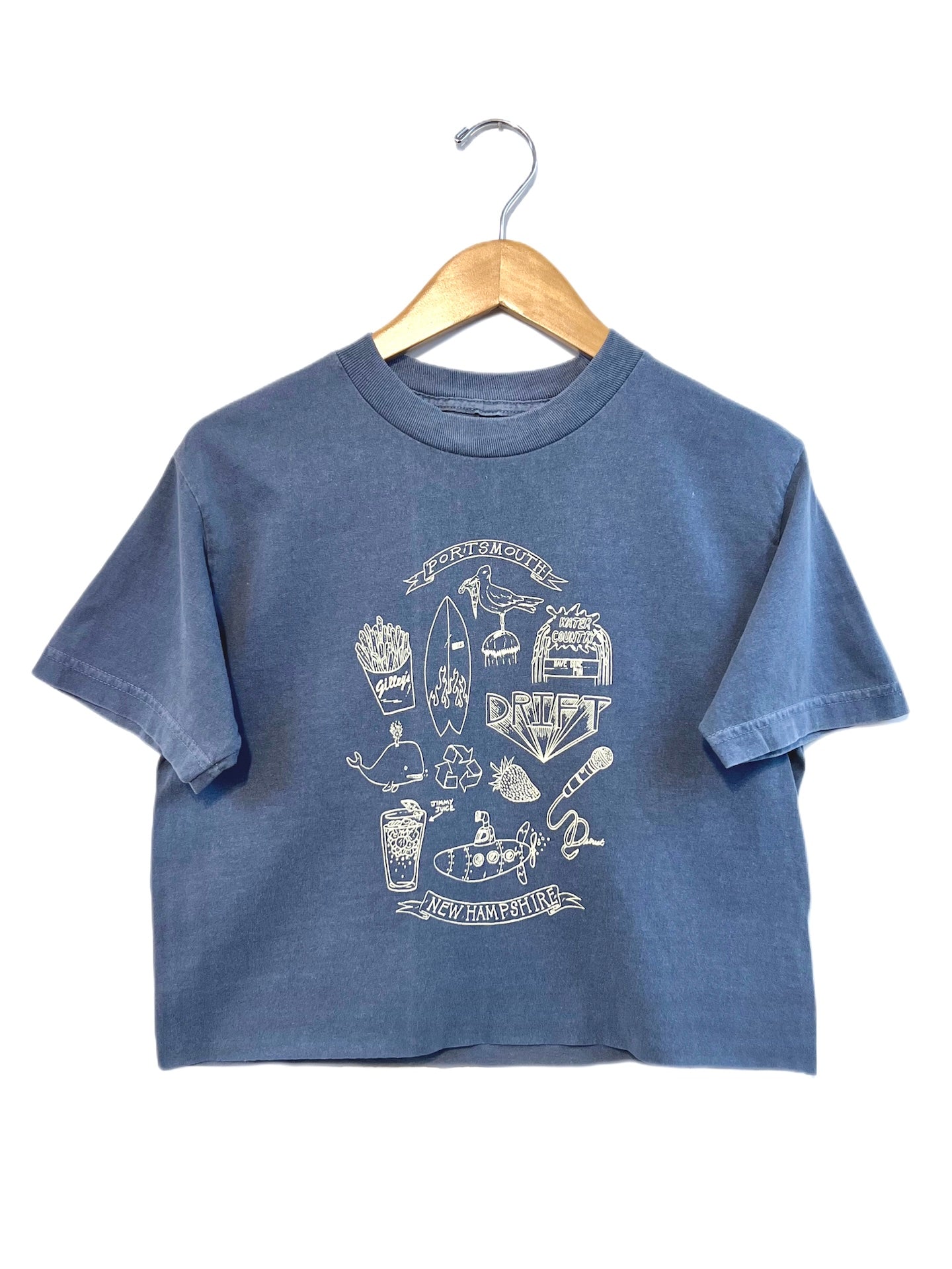 A Washed Navy tee enhanced with our PortCity graphic on the front - an homage to our favorite places & things to do in Portsmouth. Screen printed on the front in Butter Yellow.