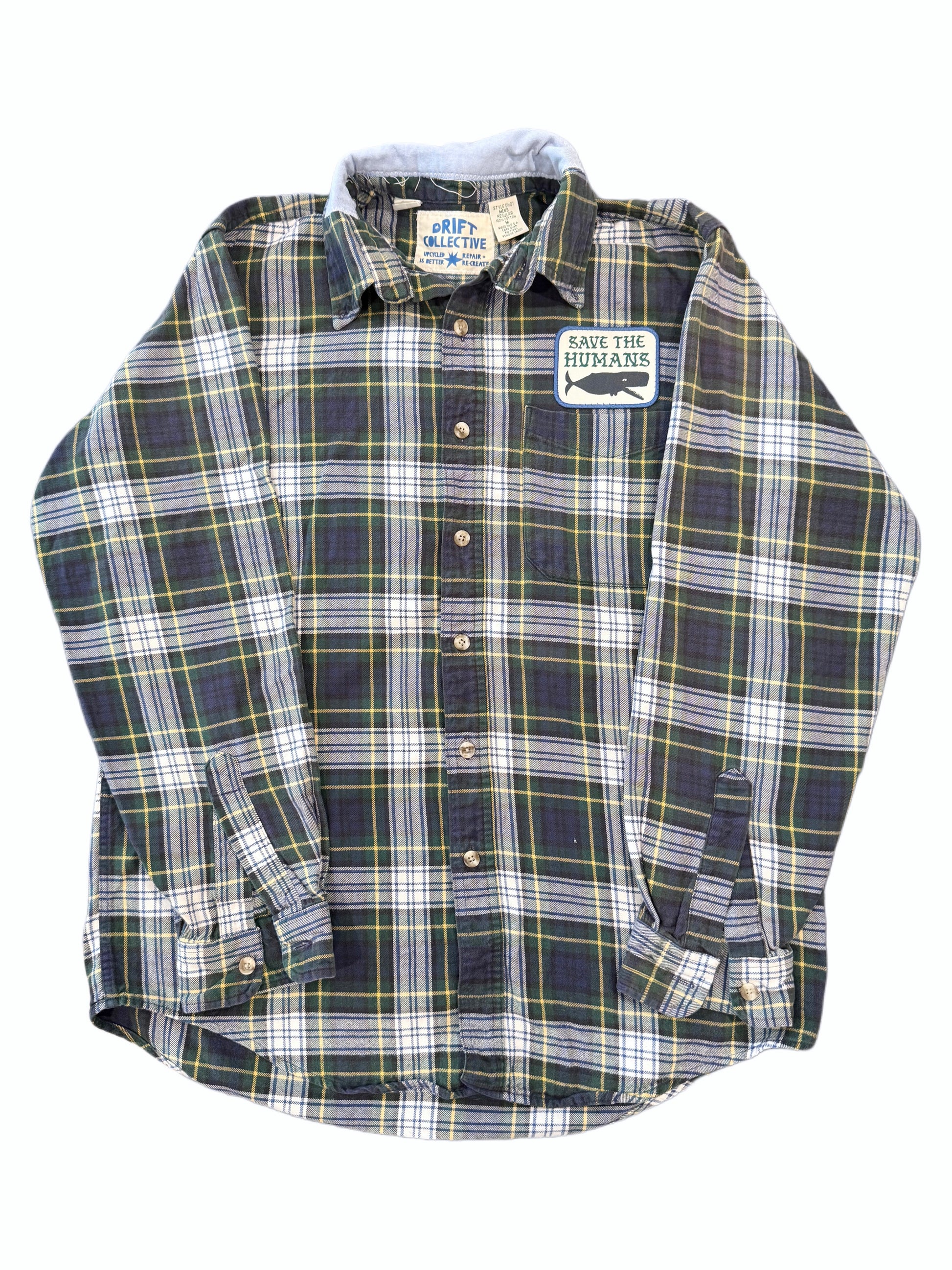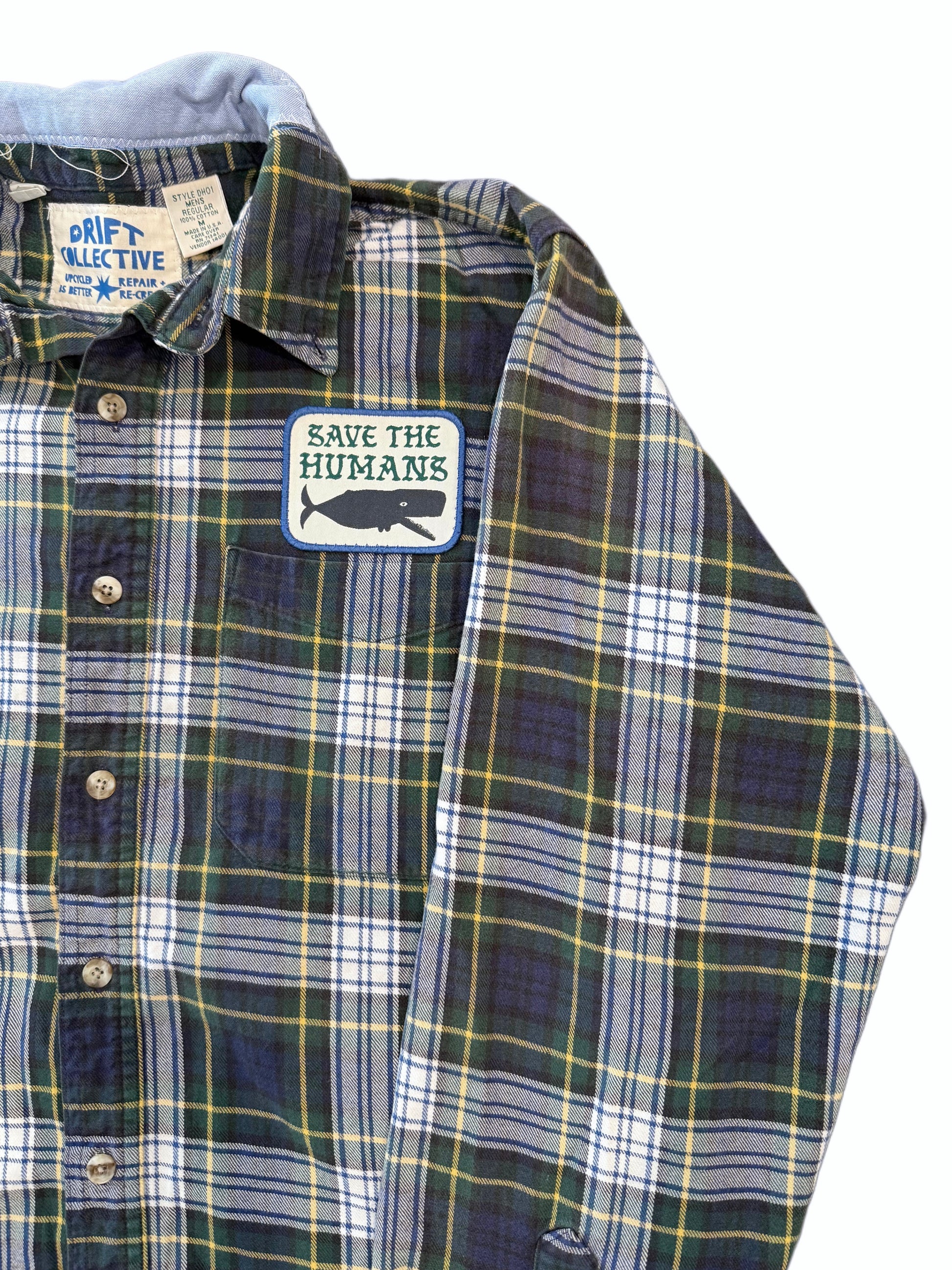A classic flannel, perfectly broken in. Enhanced with our signature Save The Humans patch on the front. Sewn at our shop in Portsmouth, NH.