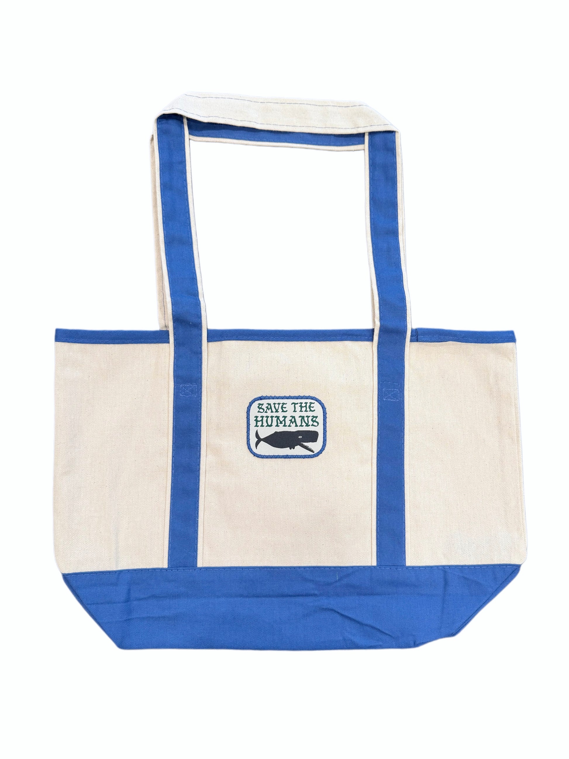 Longer straps perfect for the beach, gym, or farmers market. A classic canvas tote with contrasting blue straps featuring our Save The Humans patch on the front.