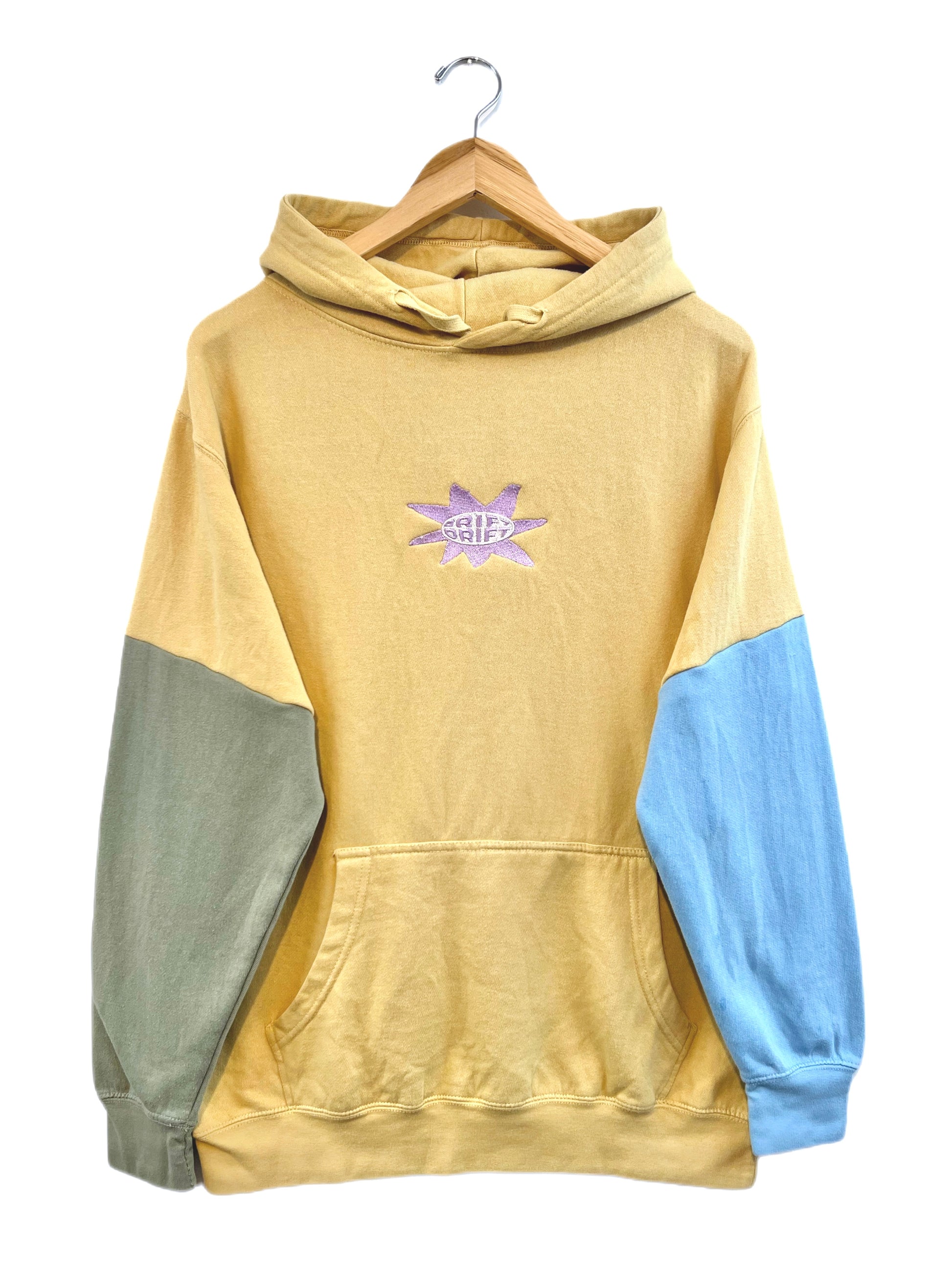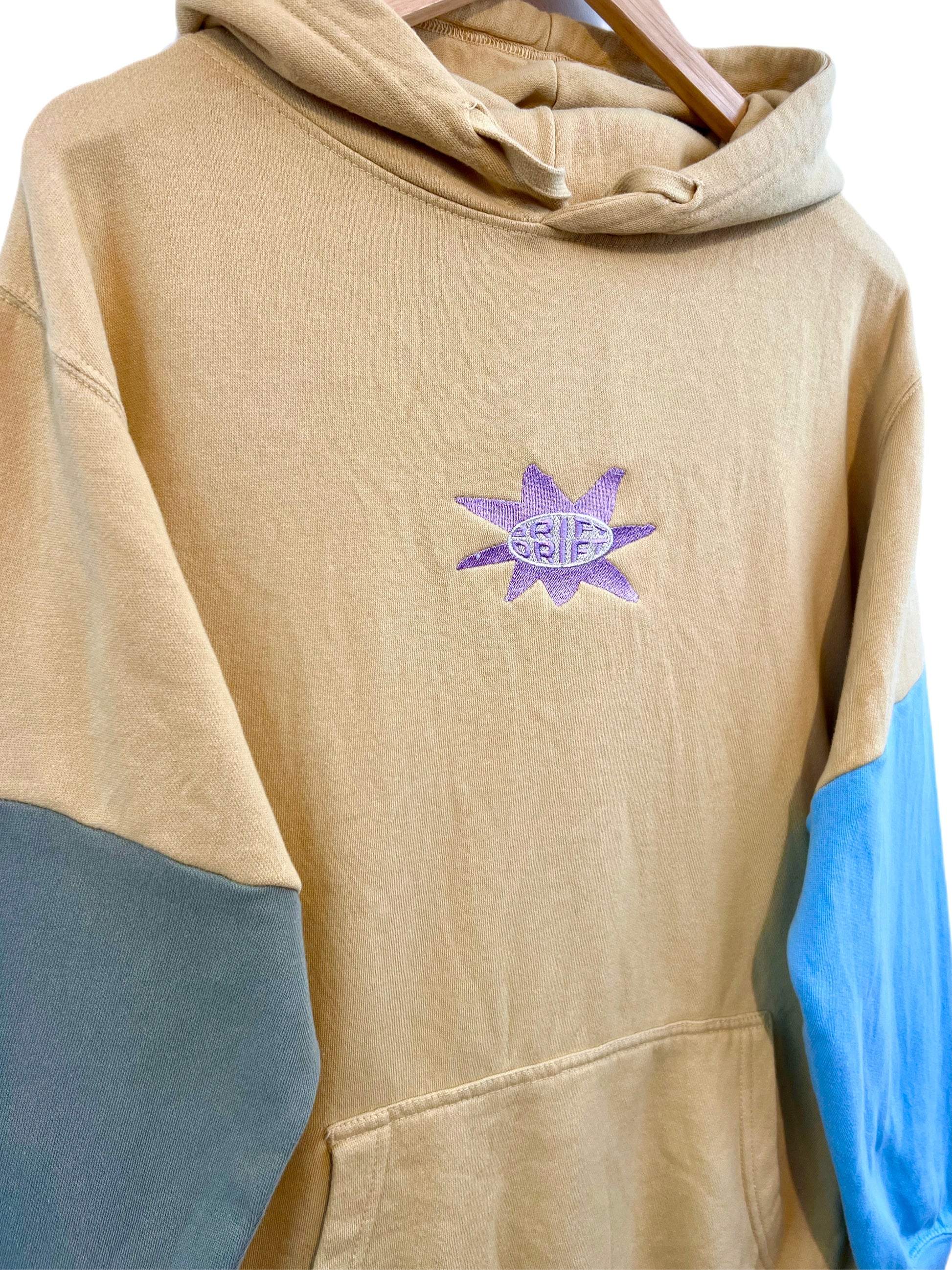 A hand reworked hoodie in retro inspired shades. Mustard base featuring Blue & Army sleeves. Enhanced with our Something Cosmic embroidery on the front.