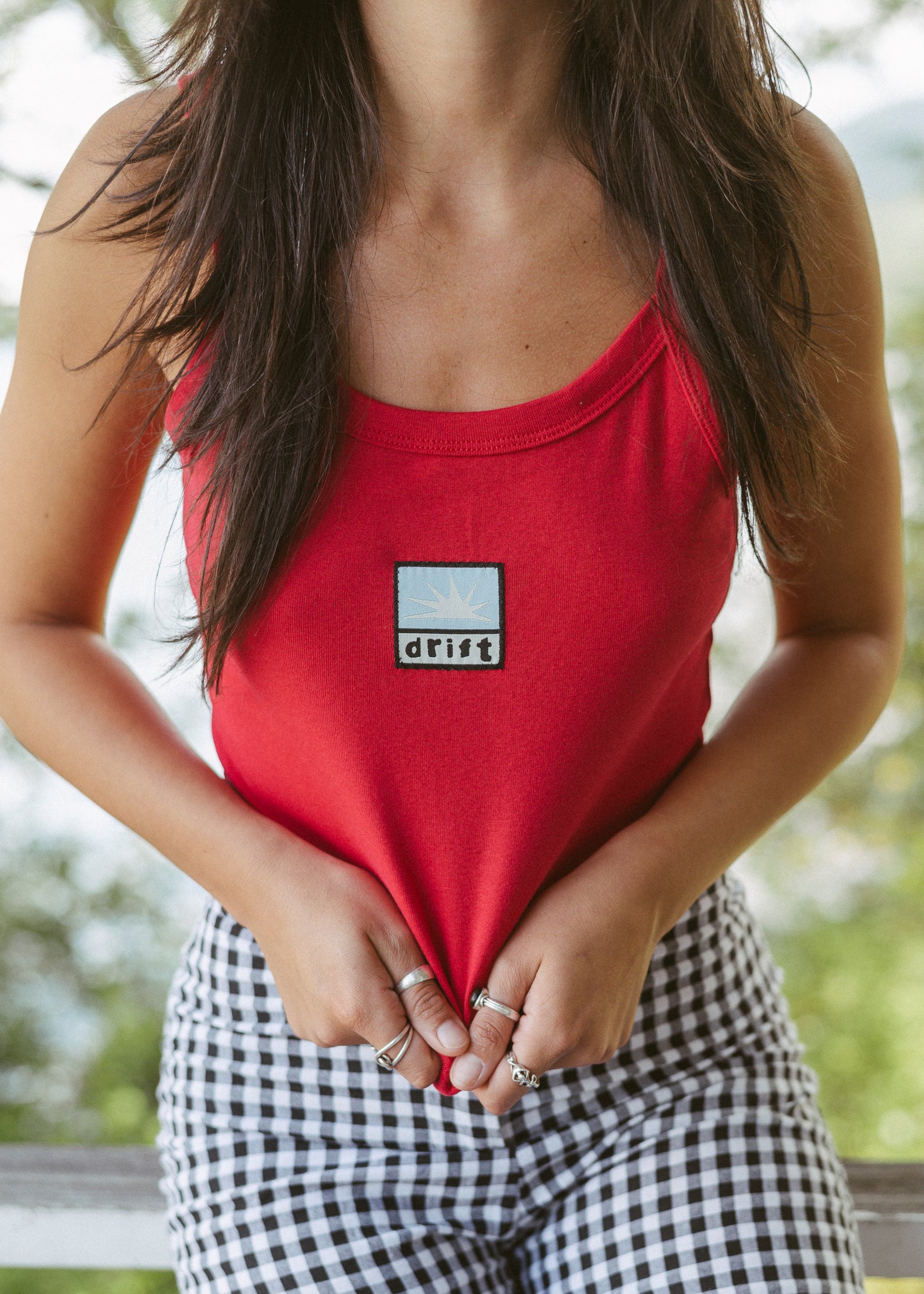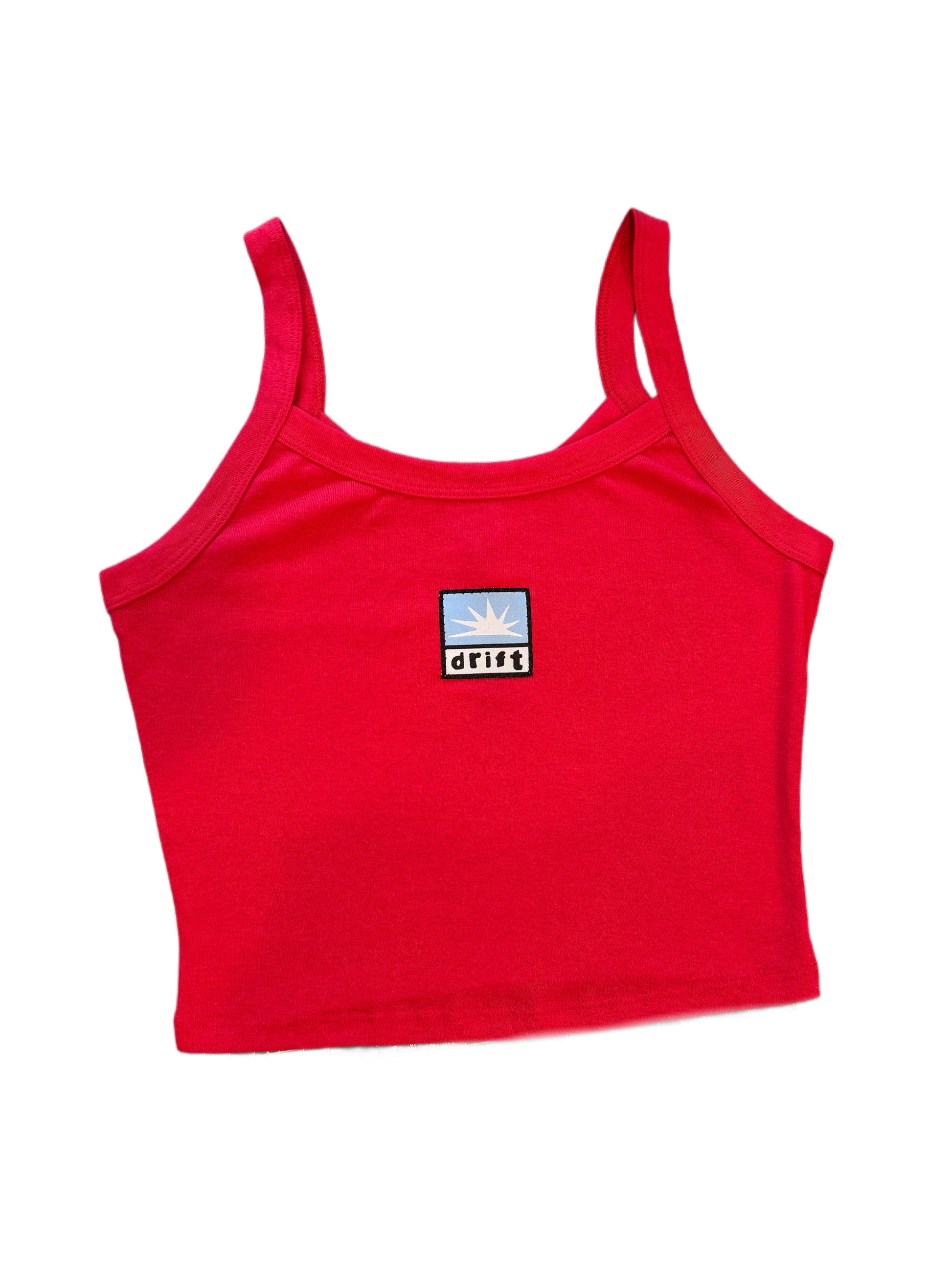 An insanely soft, 90's style tank in red. A fitted style in a cropped length. Featuring our Sparks patchwork on the front.