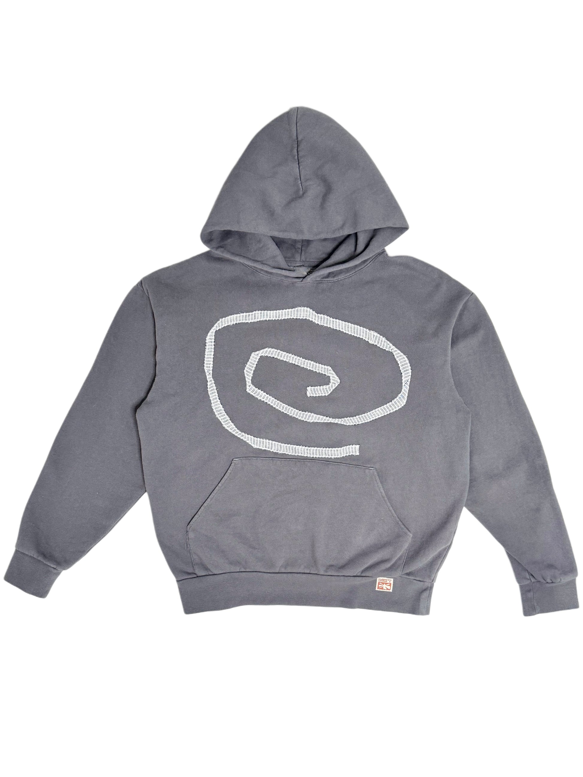 A retro inspired hoodie in a custom dyed Vintage Black. Enhanced with 1 of a kind spiral patchwork created from fabric scraps.