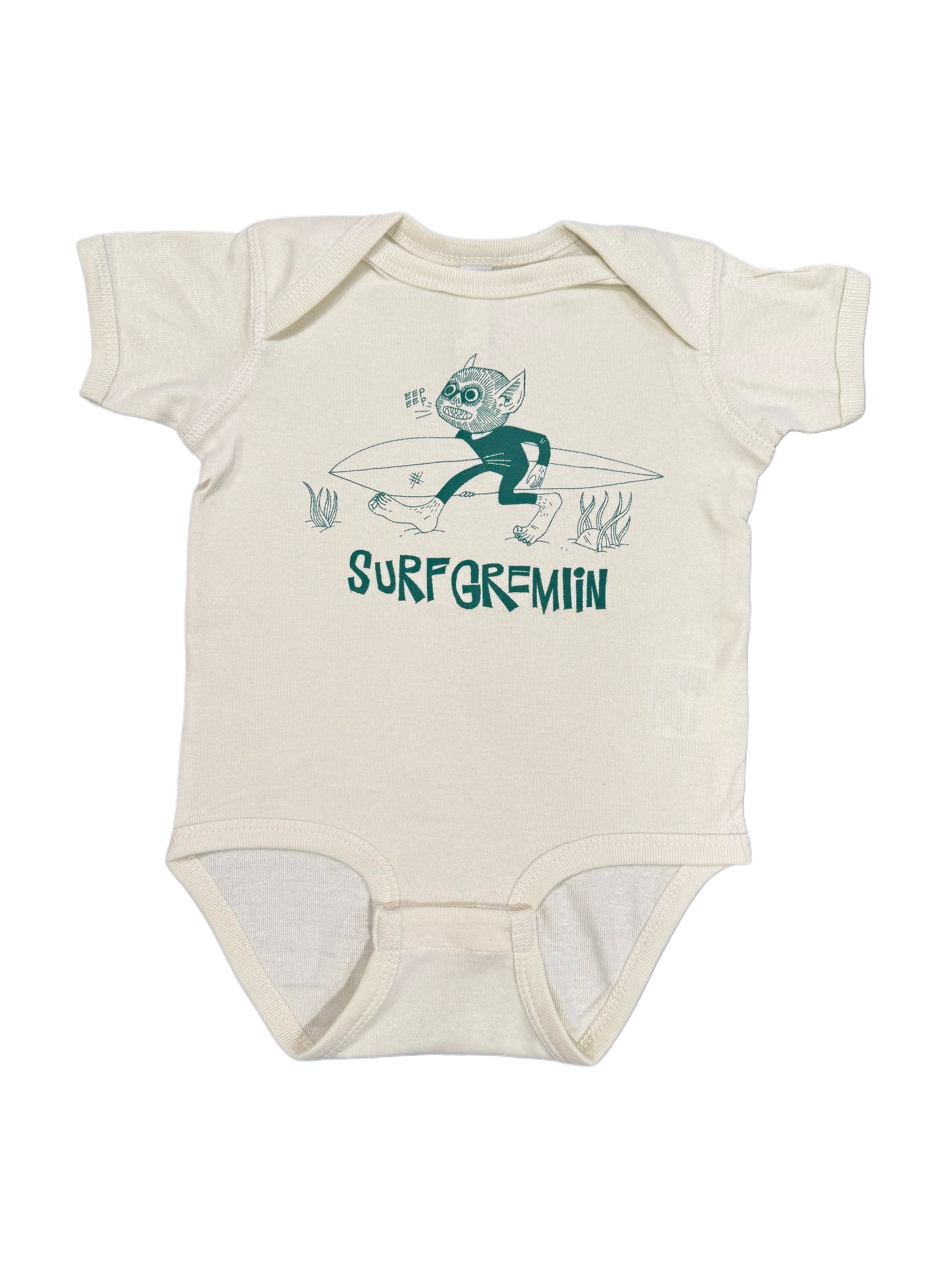 A short sleeve onesie in Ivory. Featuring our "Surf Gremlin" graphic.