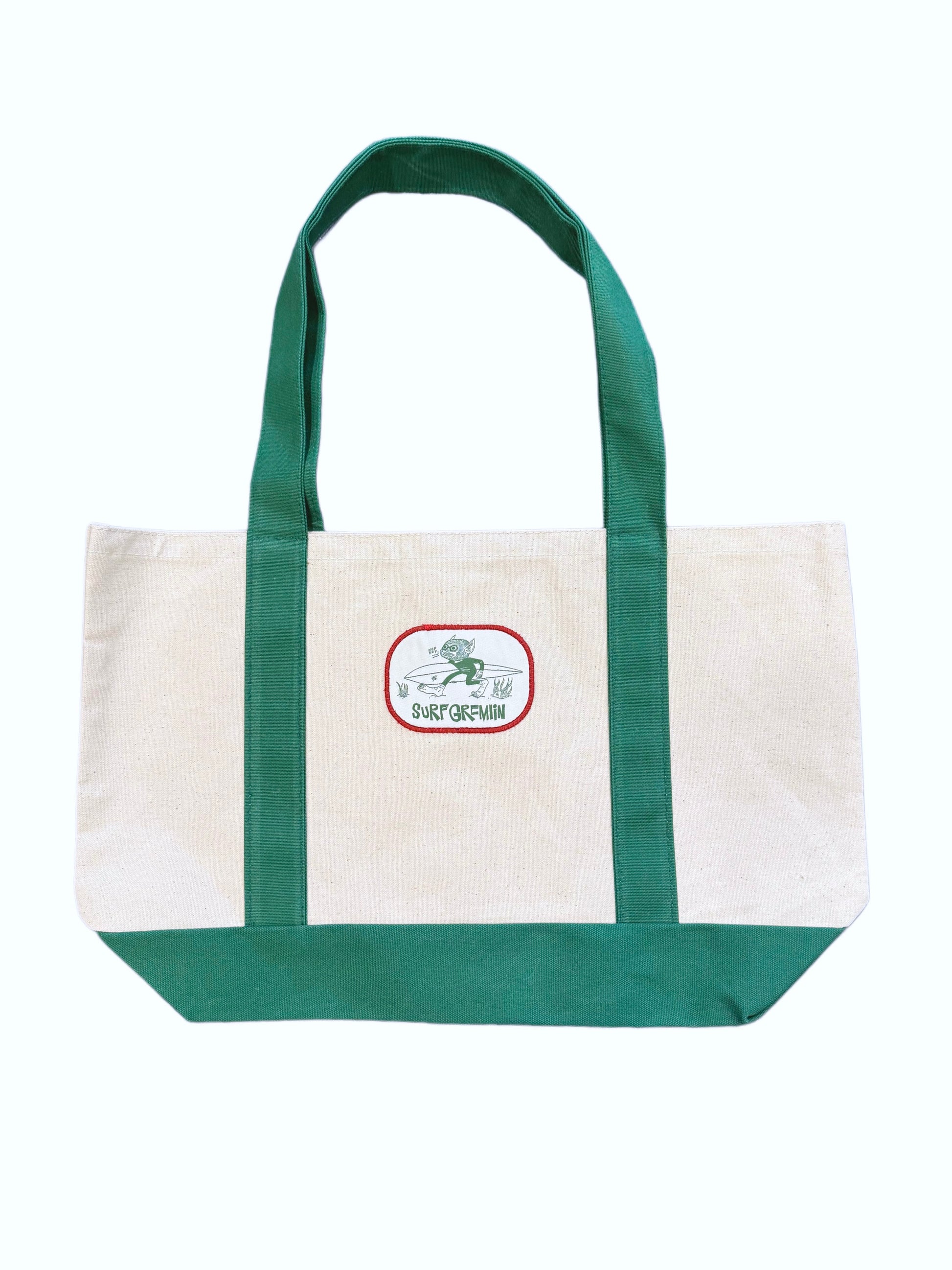 Longer straps perfect for the beach, gym, or farmers market. A classic canvas tote with contrasting green straps featuring our Surf Gremlin patch on the front.