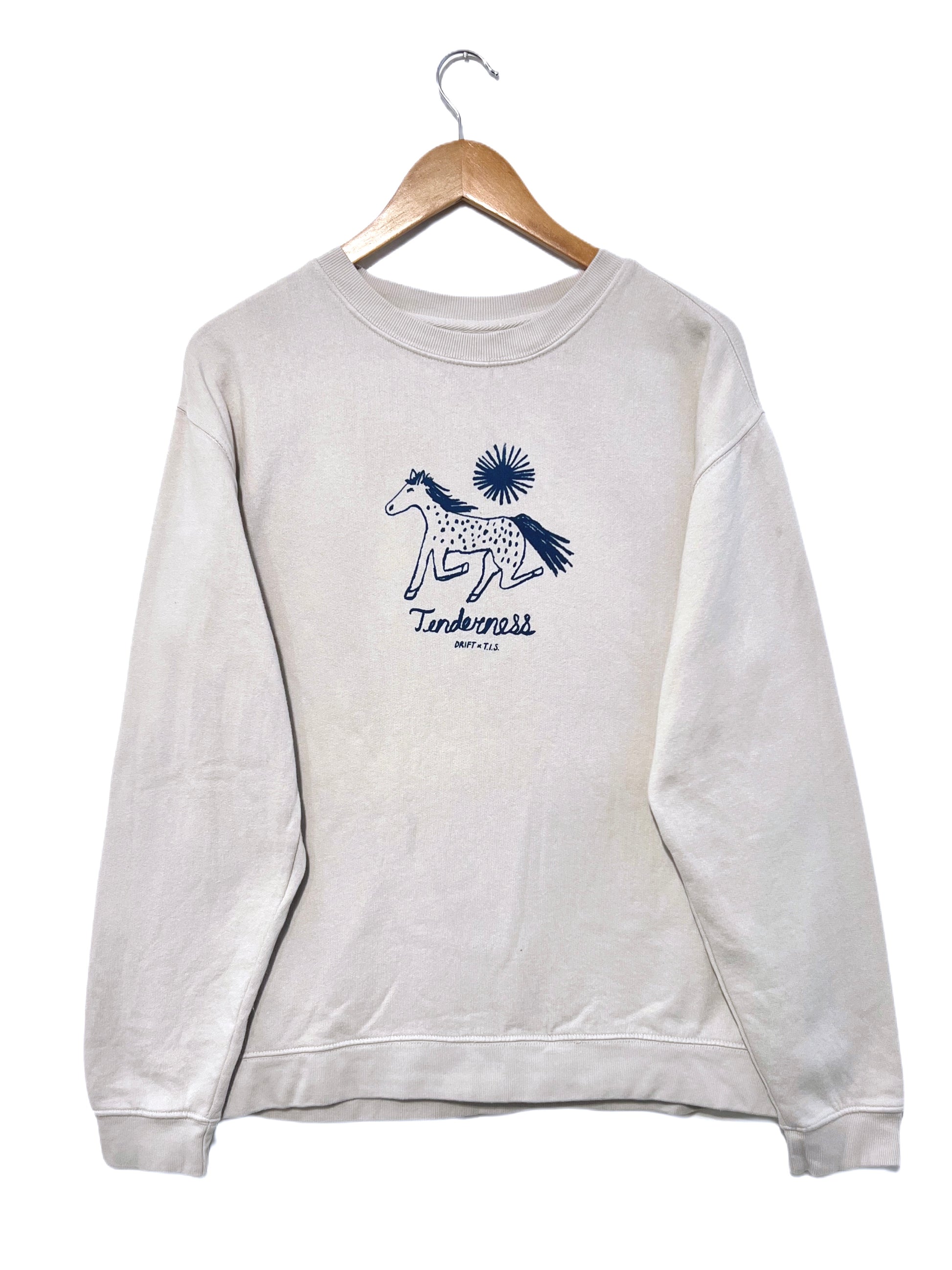 A Sand crewneck hand printed with the Tenderness horse graphic in Blue. Designed by local artist Trust In She.