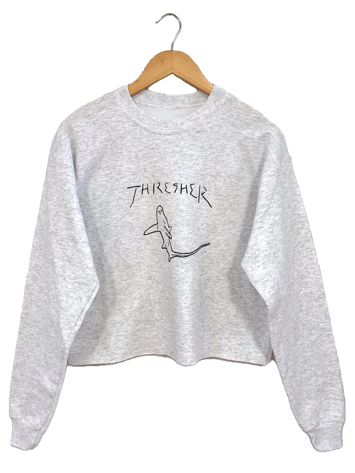 Classic ash crewneck, hand-printed with our signature Thresher Shark graphic.