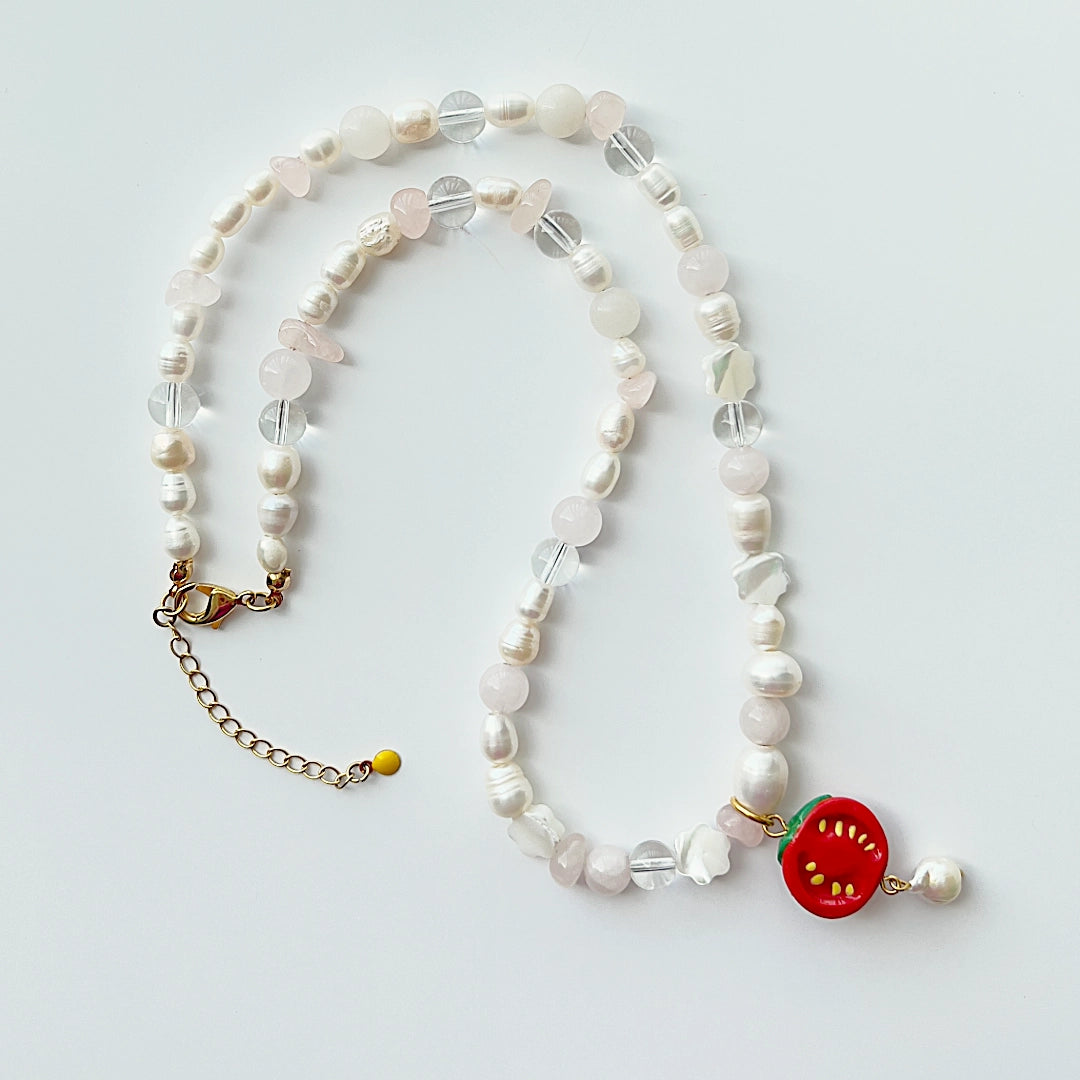 The Fancy Tomato Necklace is a beautiful and fashionable necklace handmade with freshwater pearls, quartz and crystal beads and a hand painted polymer clay tomato. 🍅
