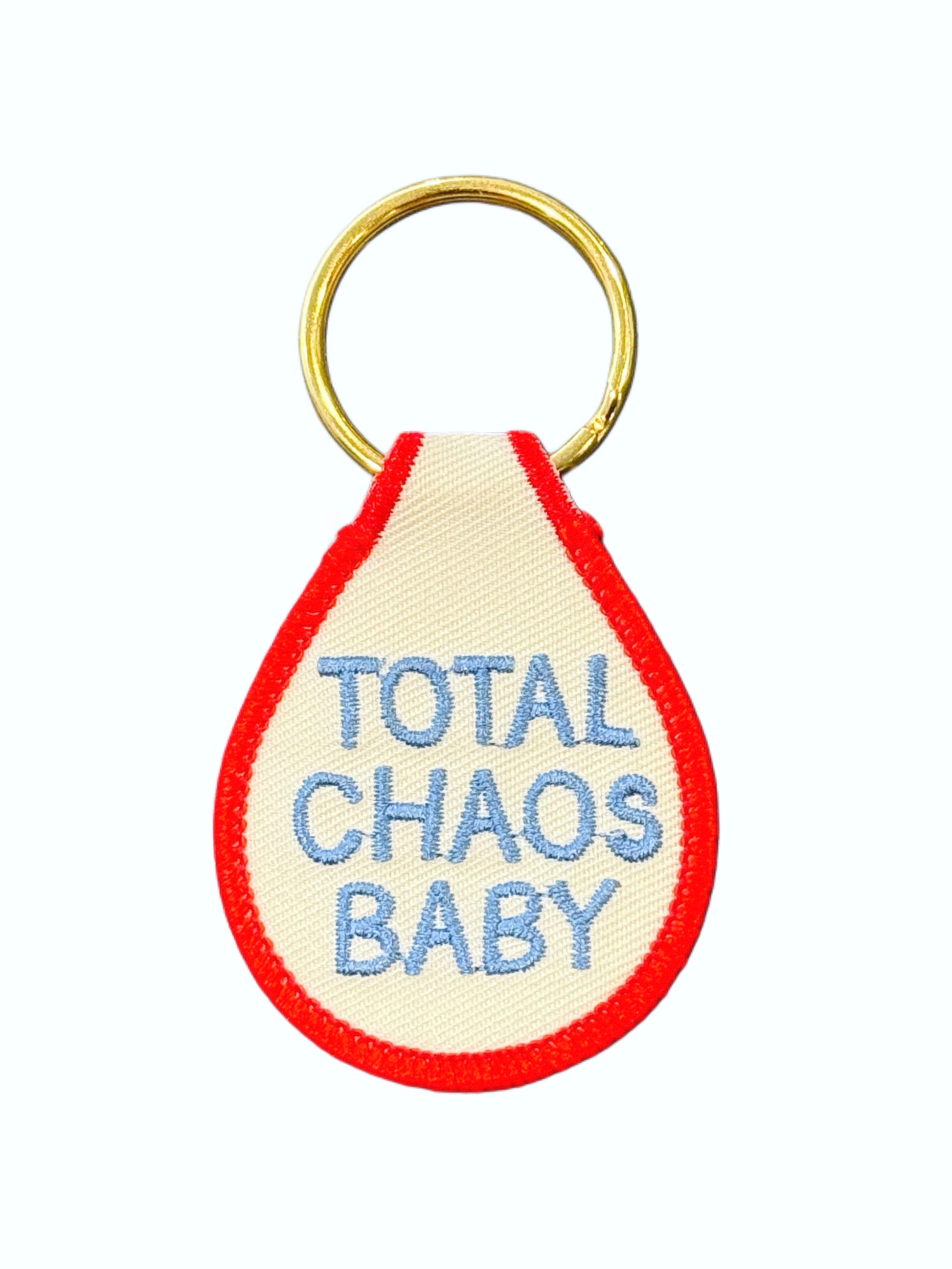 Off white background with a contrasting red edge. Featuring our best selling "Total Chaos Baby" graphic on both sides in light blue.