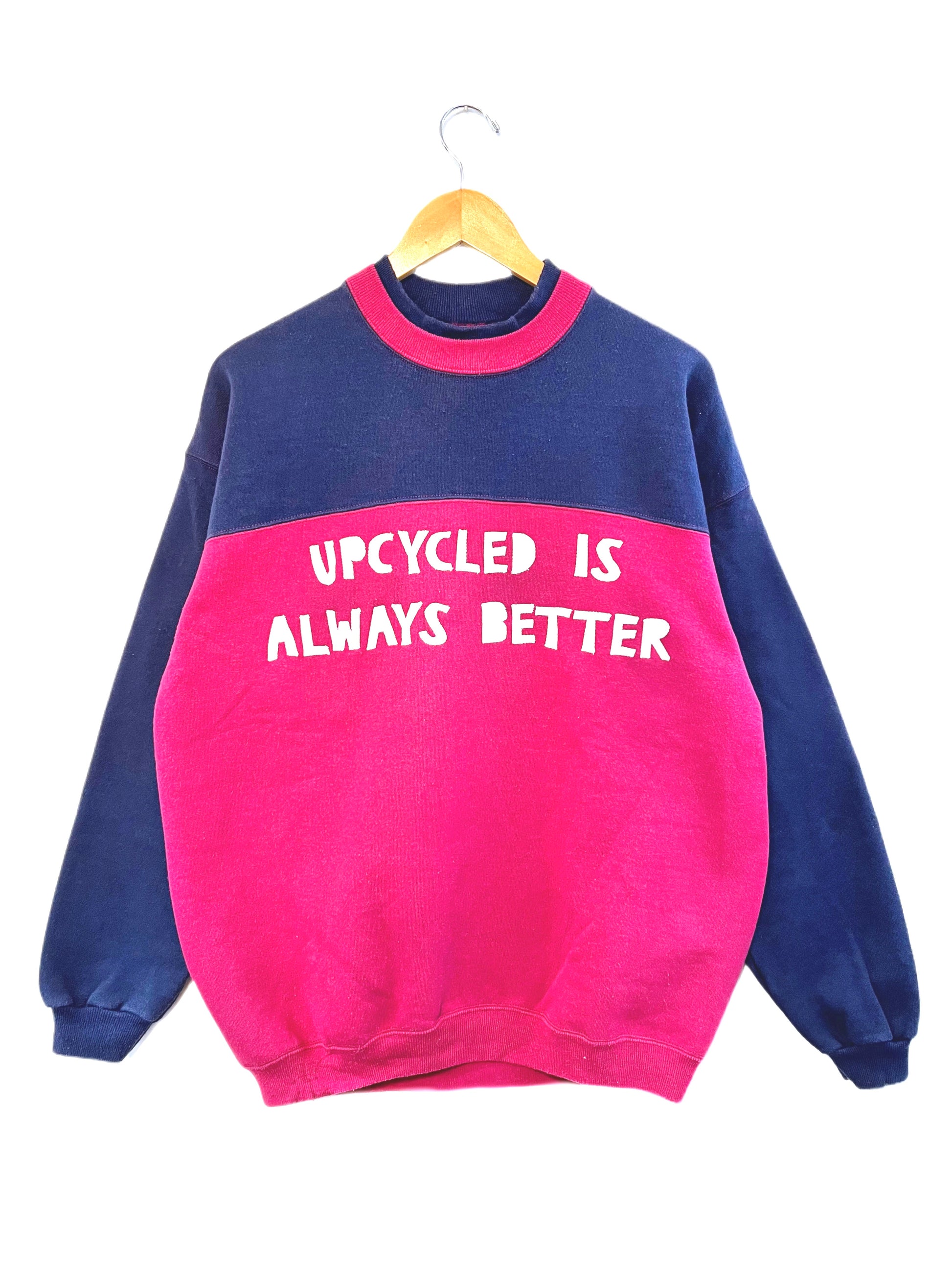 A vintage crewneck featuring our latest upcycling technique. Unique lettering individually crafted from scrap fabric & locally sourced second hand materials that otherwise may have ended up in a landfill. Each letter has been meticulously cut then sewn by our team to make up the phrase UPCYCLED IS ALWAYS BETTER. A lengthy process that produces an entirely 1 of a kind, 100% upcycled product.