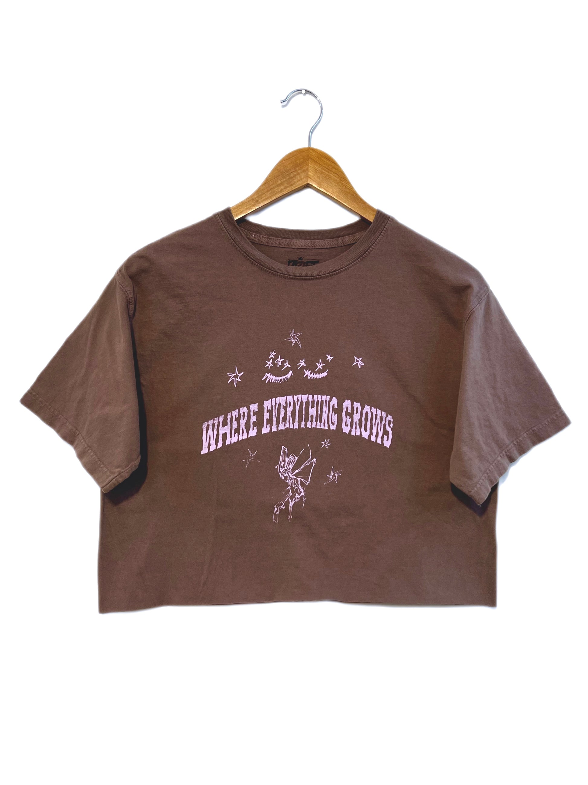 An insanely soft, classic style tee in Cocoa. Featuring the "Where Everything Grows" graphic by artist David Daisy screenprinted on the front in lilac.