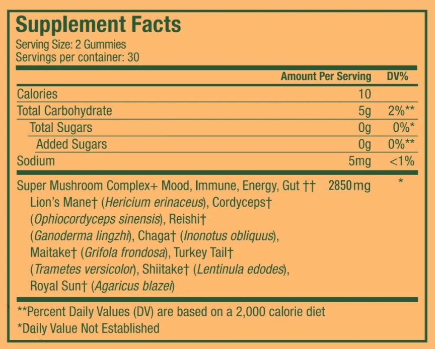 Our best-selling zero-sugar, mushroom gummies help to support mood, stress, energy and immunity. Each serving is a mushroom POWERHOUSE with 8+ functional mushrooms. 60 gummies per pouch. 30-day supply. Why It's Special: FLAVOR: Chef-crafted organic, wild raspberry flavor ALWAYS: Vegan, gluten-free, lab-tested, top 8 allergen free, chef-crafted, research-backed, 100% real NEVER: High-fructose corn syrup, food dyes, dextrose, sucrose, seed oils, herbicides and pesticides POTENCY: Research-backed formula of Lion’s Mane, Chaga, Reishi, Turkey Tail, Royal Sun and Cordyceps. 100% Fruiting Body & 10:1 Extract PACKAGING: Recycled, resealable, on-the-go pouch